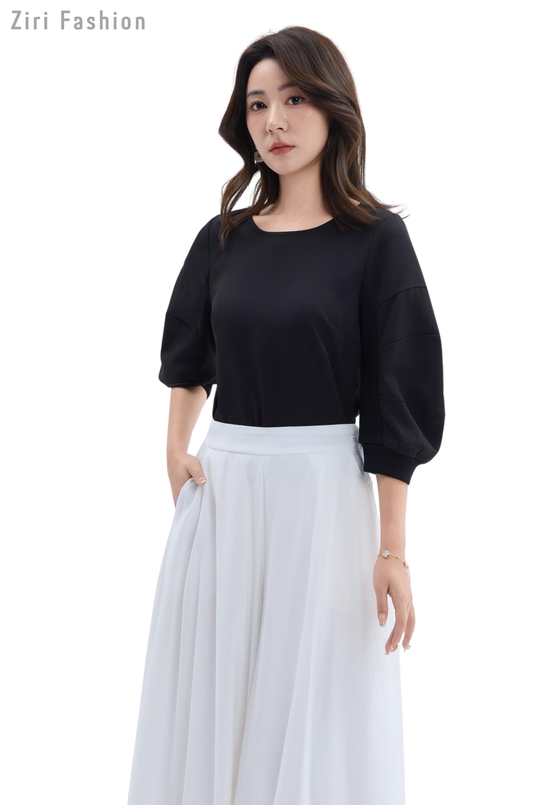 10241213 Elegant Puff Sleeve Round Neck Blouse