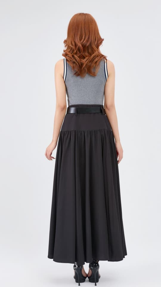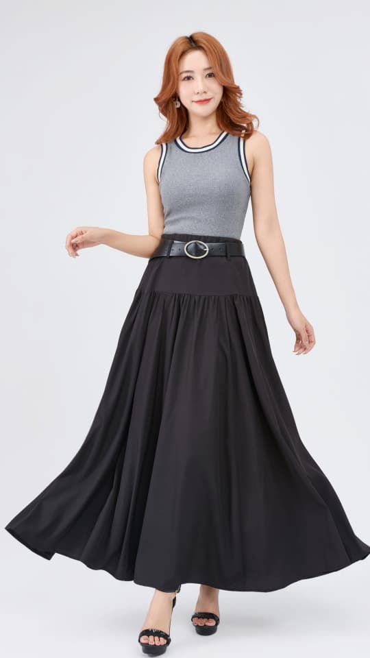 A timeless maxi skirt designed with soft movement and refined balance. Featuring a high-waist cut with gentle gathers, this skirt naturally elongates the silhouette while flowing smoothly over the hips and thighs—never tight, never bulky. The A-line shape creates graceful movement with every step, offering comfort without sacrificing elegance.