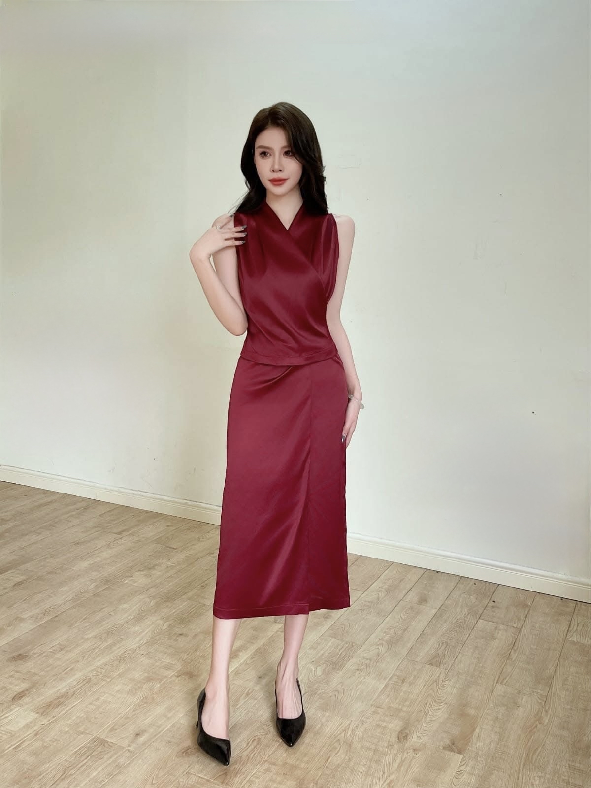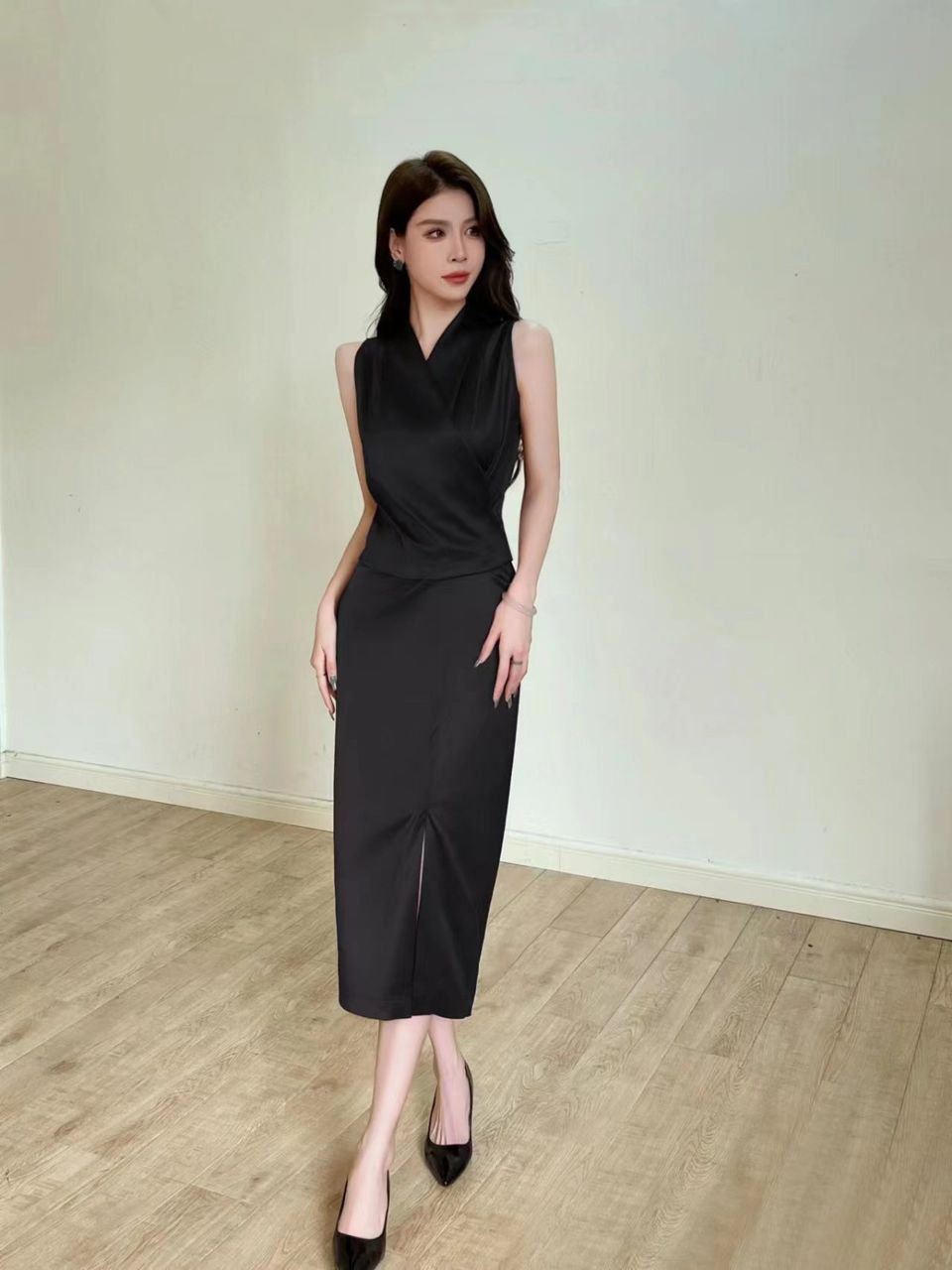 A sleek and timeless midi pencil skirt designed to flatter your curves while keeping you comfortable. The front slit adds ease of movement and a touch of allure, making it perfect for both office and evening occasions.