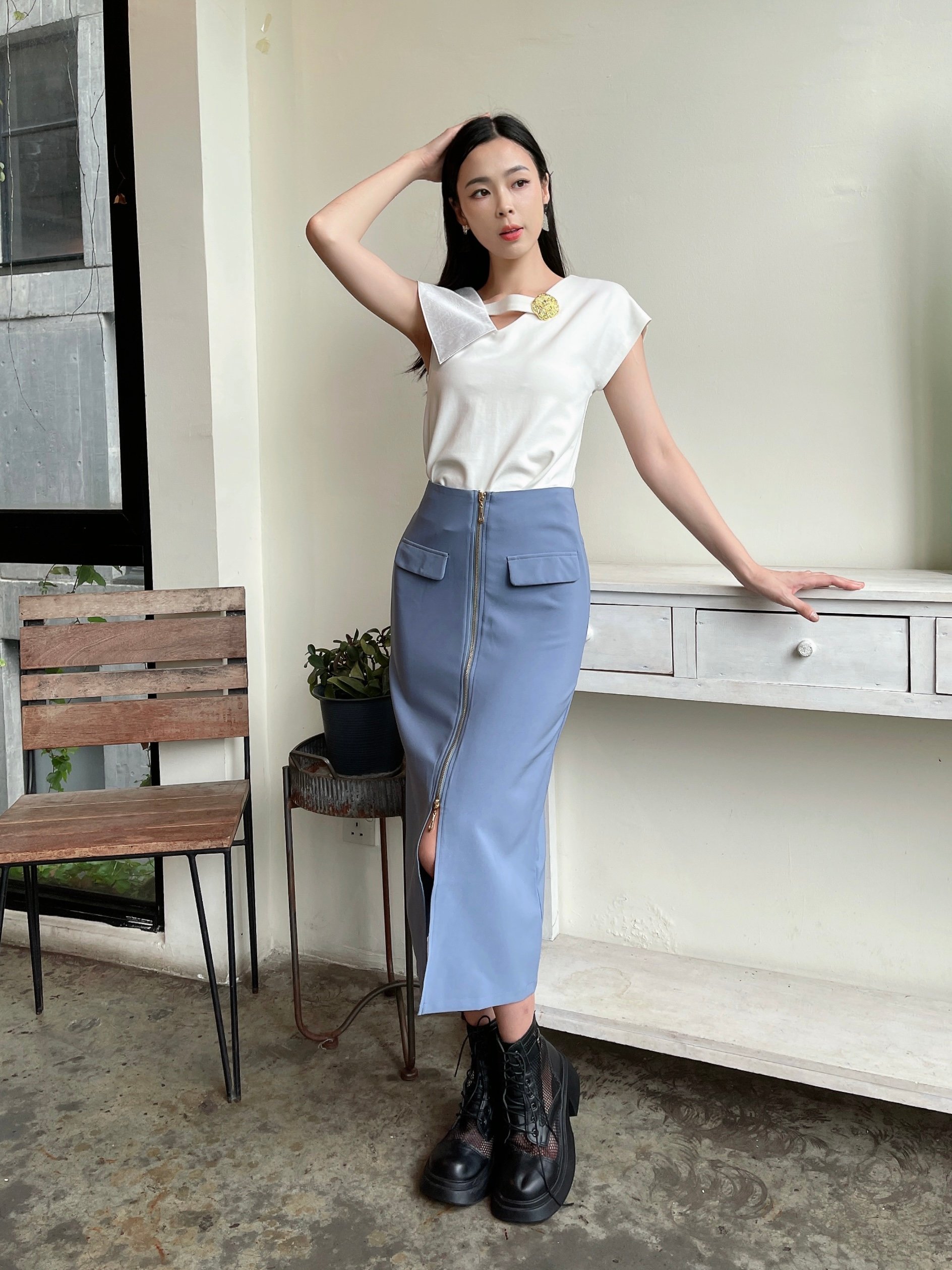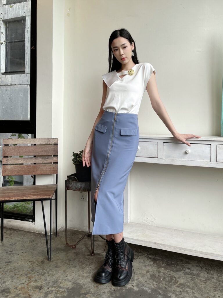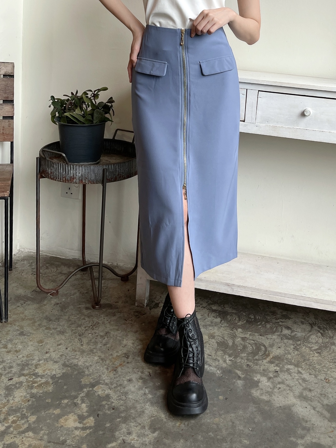 This maxi dress combines the sleek lines of a front zipper with the allure of a high slit, creating a captivating look with every step. The body-hugging silhouette accentuates your curves, while the minimalistic zipper detail adds a touch of modern flair.
