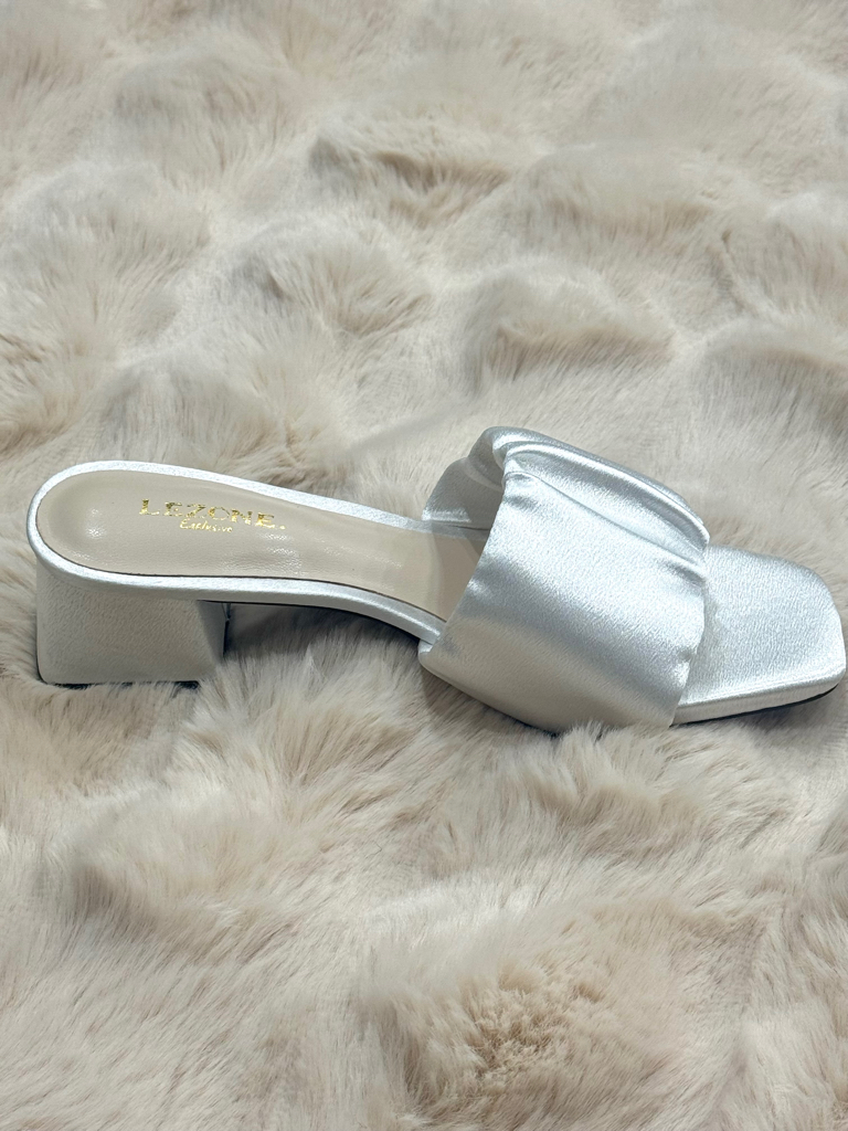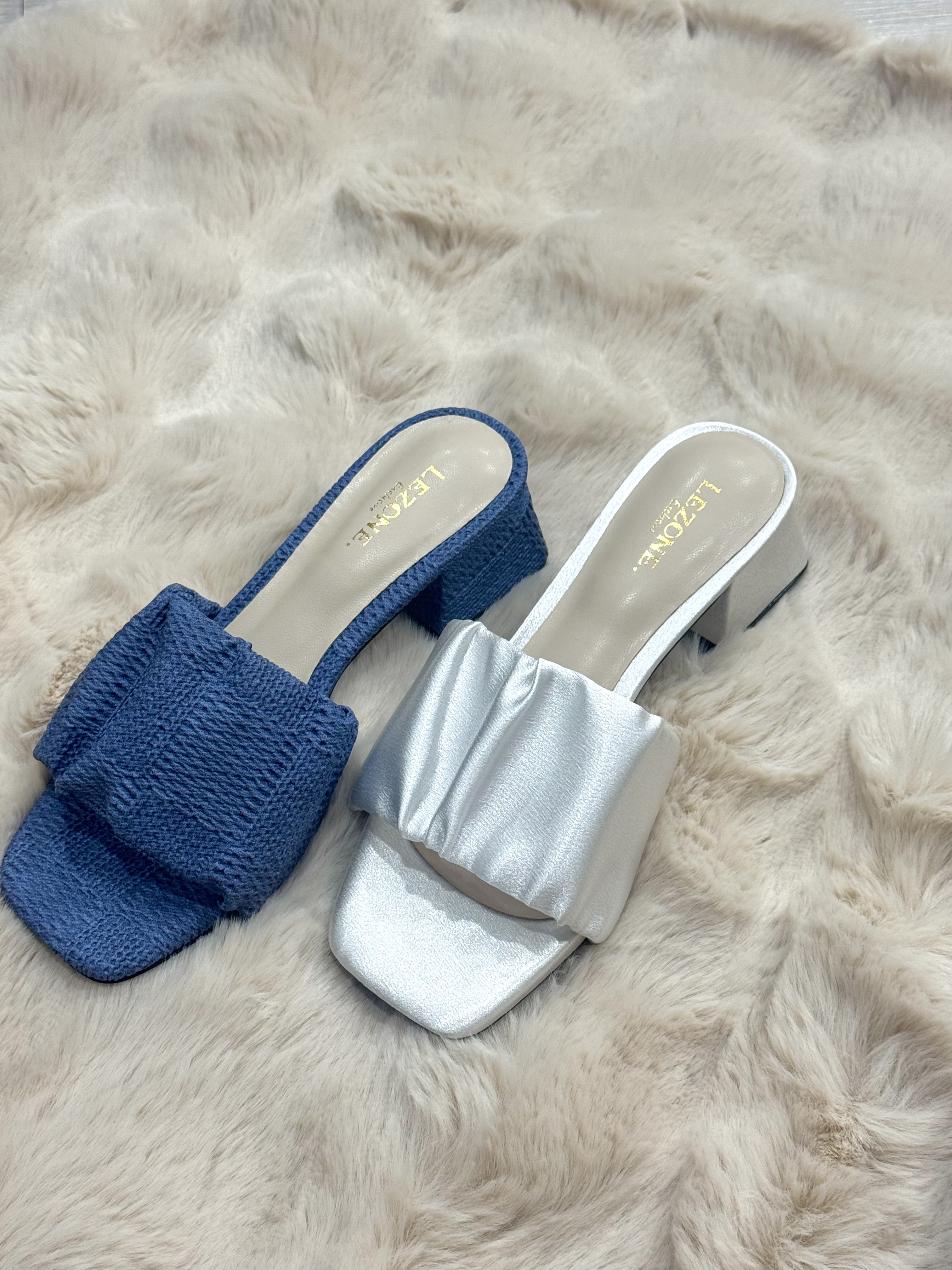 Featuring a statement ruched strap and modern block heel, these mules blend comfort with contemporary elegance. The satin-finish silver brings a subtle glow for evening glam, while the textured navy option offers timeless chic for daytime wear. Perfect for elevating both casual denim and refined dresses, this versatile design ensures you shine on every occasion.