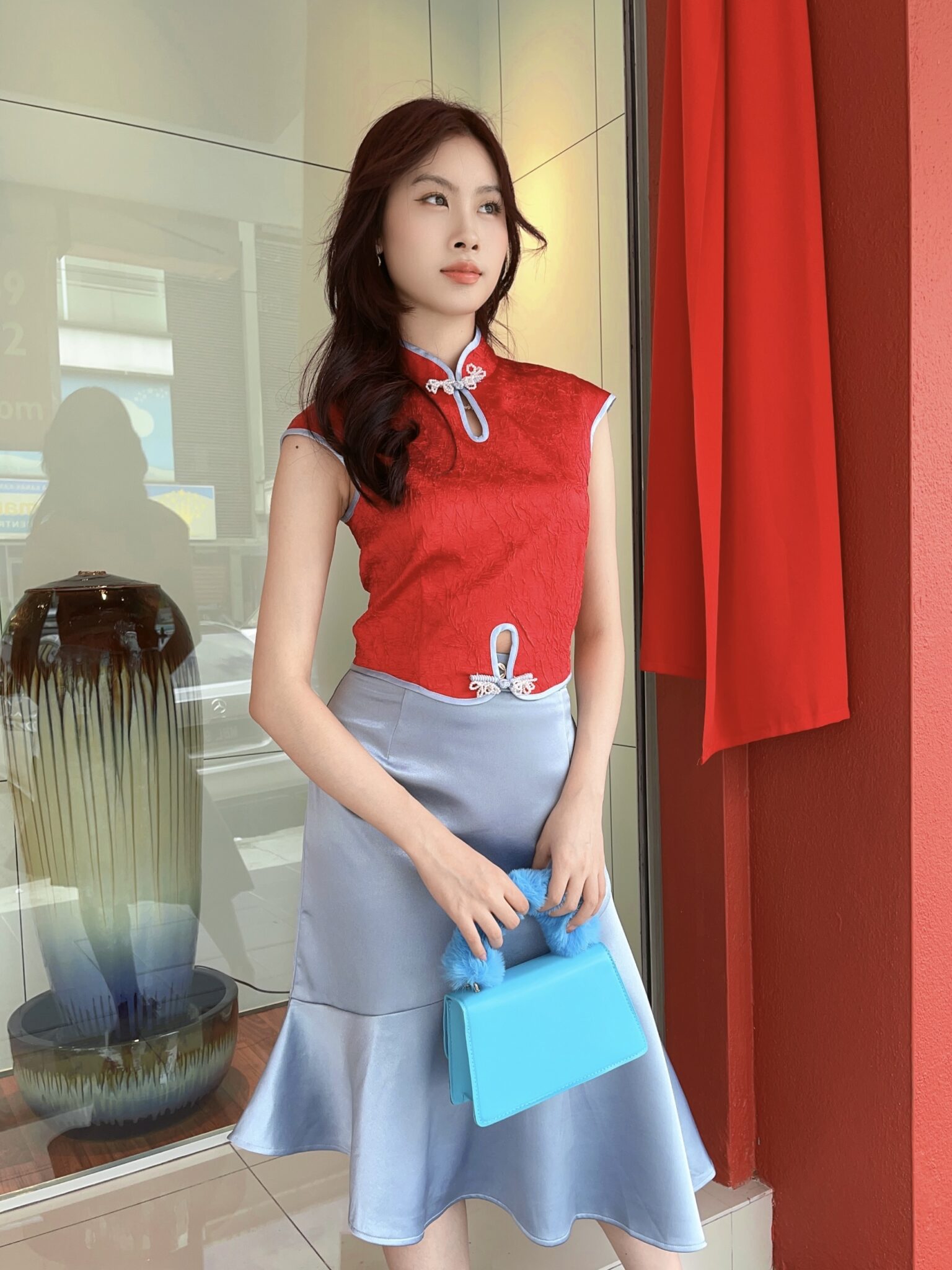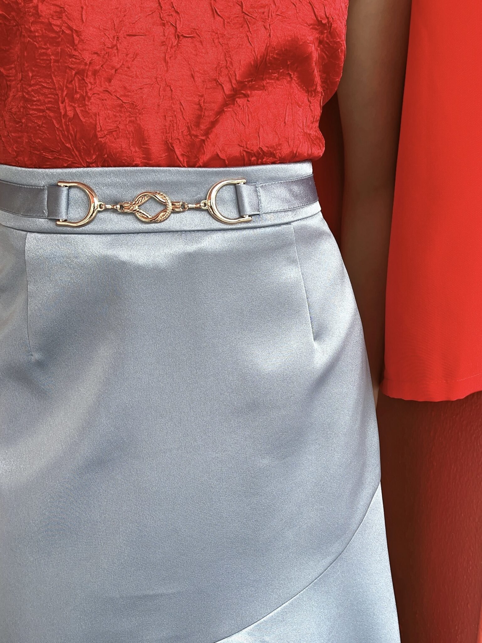 An elegant mermaid-style skirt crafted from light-reflecting satin fabric that glows with grace. The fitted silhouette highlights the waist and hips, while the ruffle hem adds movement and a soft, feminine flair. Perfect for formal events or sophisticated outings.