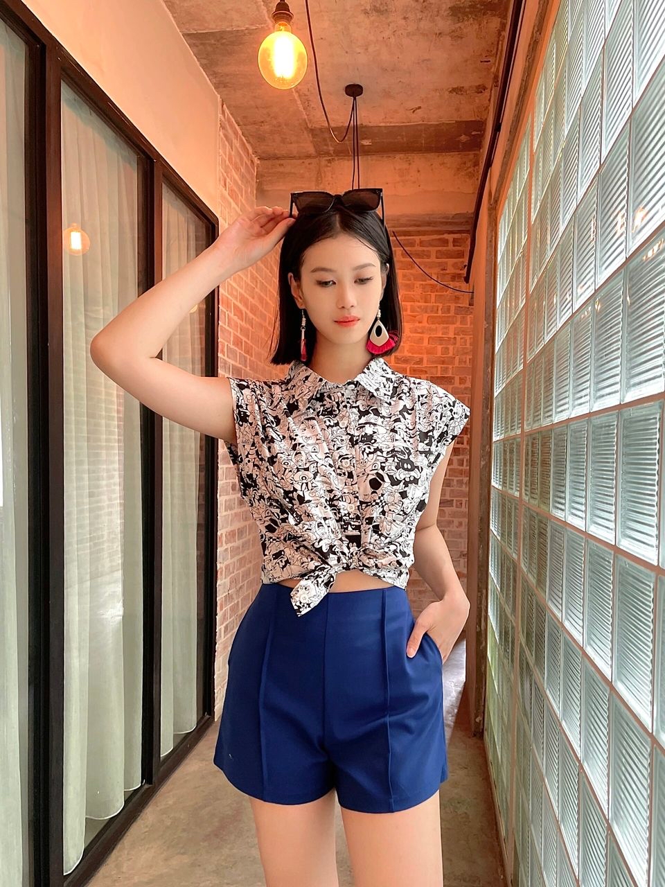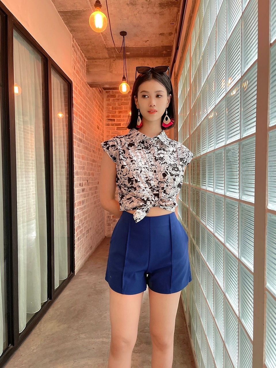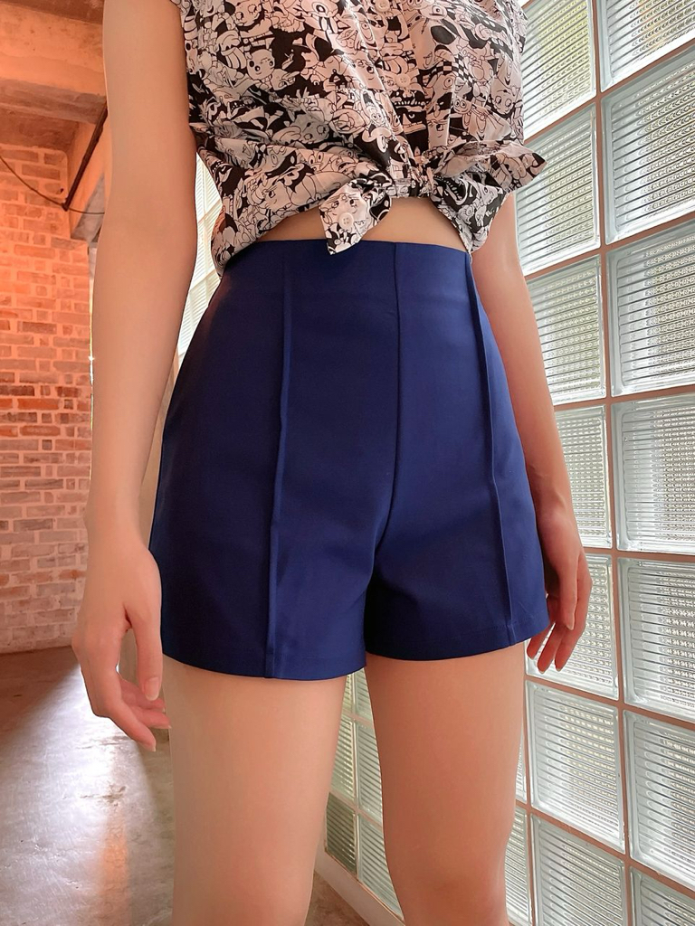 These are high-waisted tailored shorts in a rich cobalt blue. Designed with clean front seams for a sleek, elongating effect, they offer a structured fit that balances casual ease with polished style — perfect for pairing with printed tops or crisp shirts for a chic summer look.