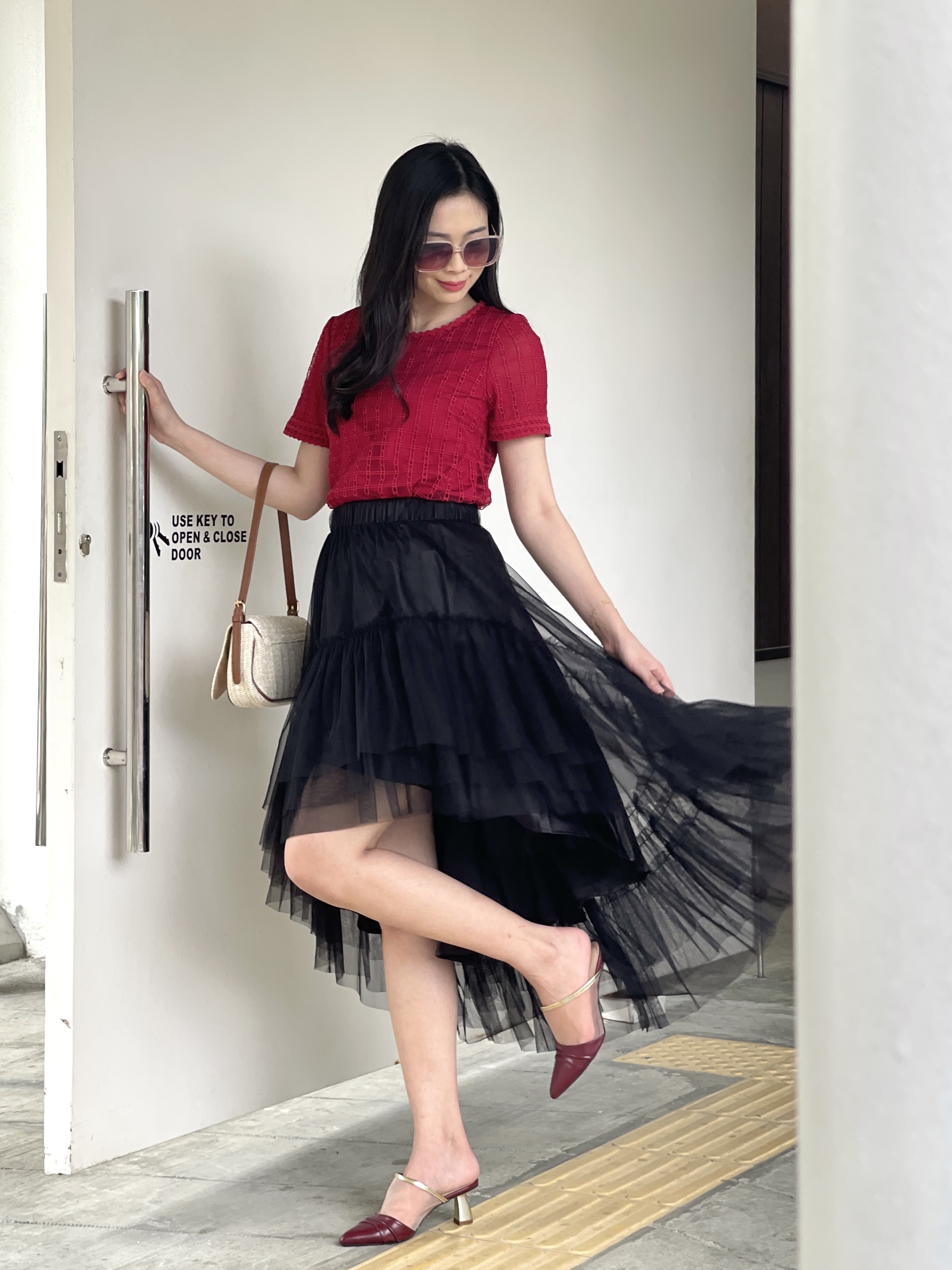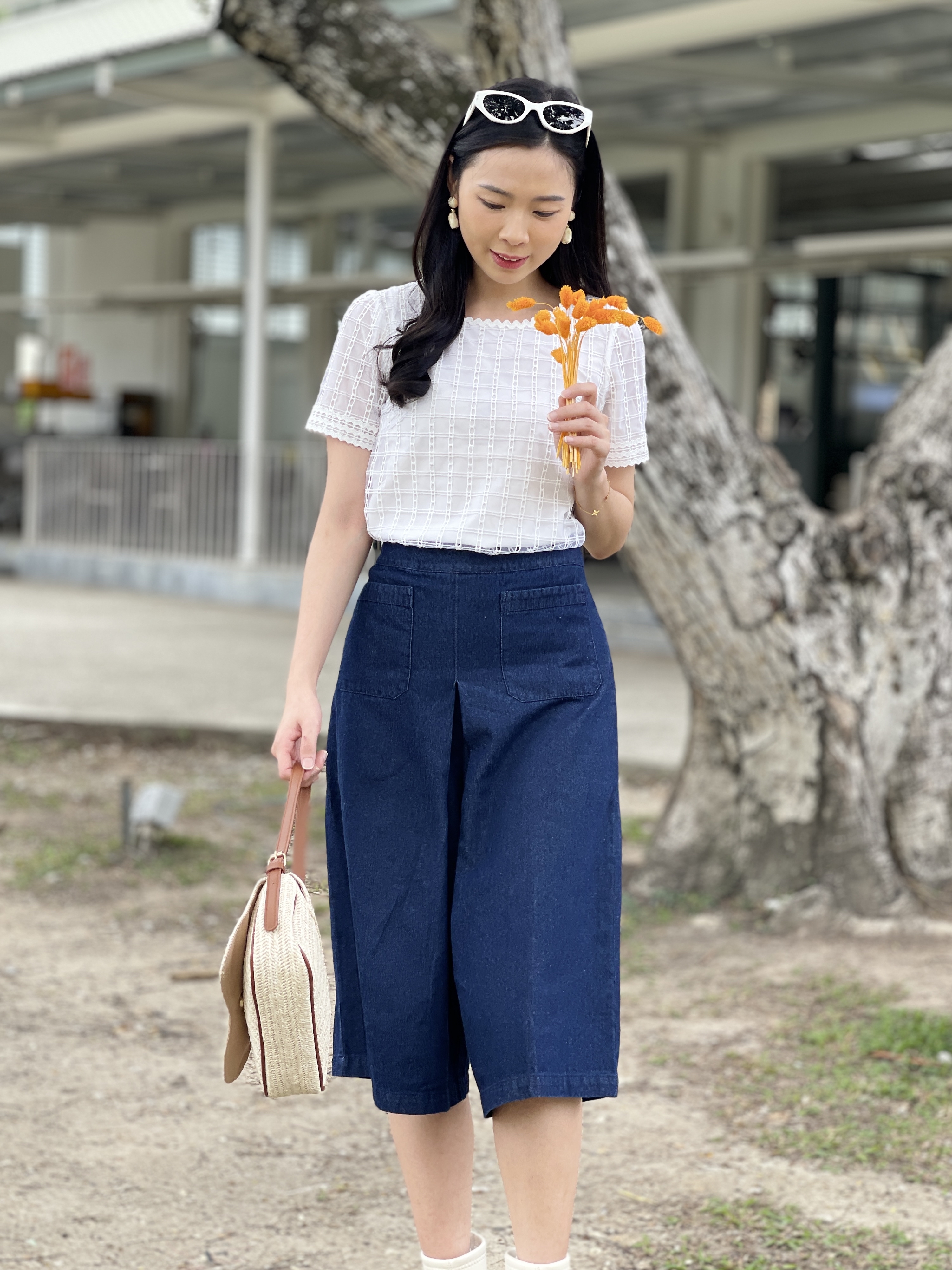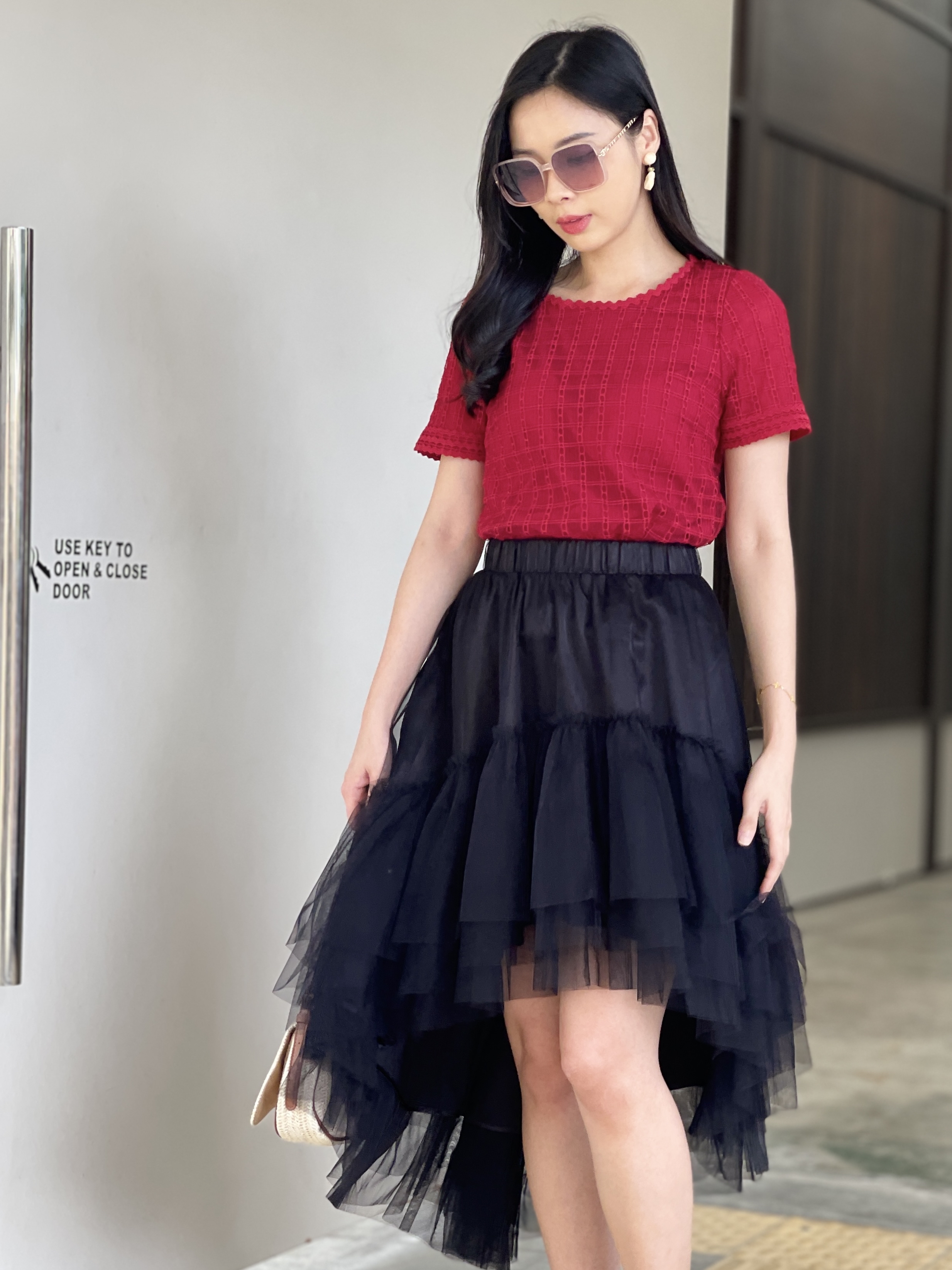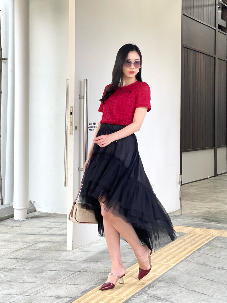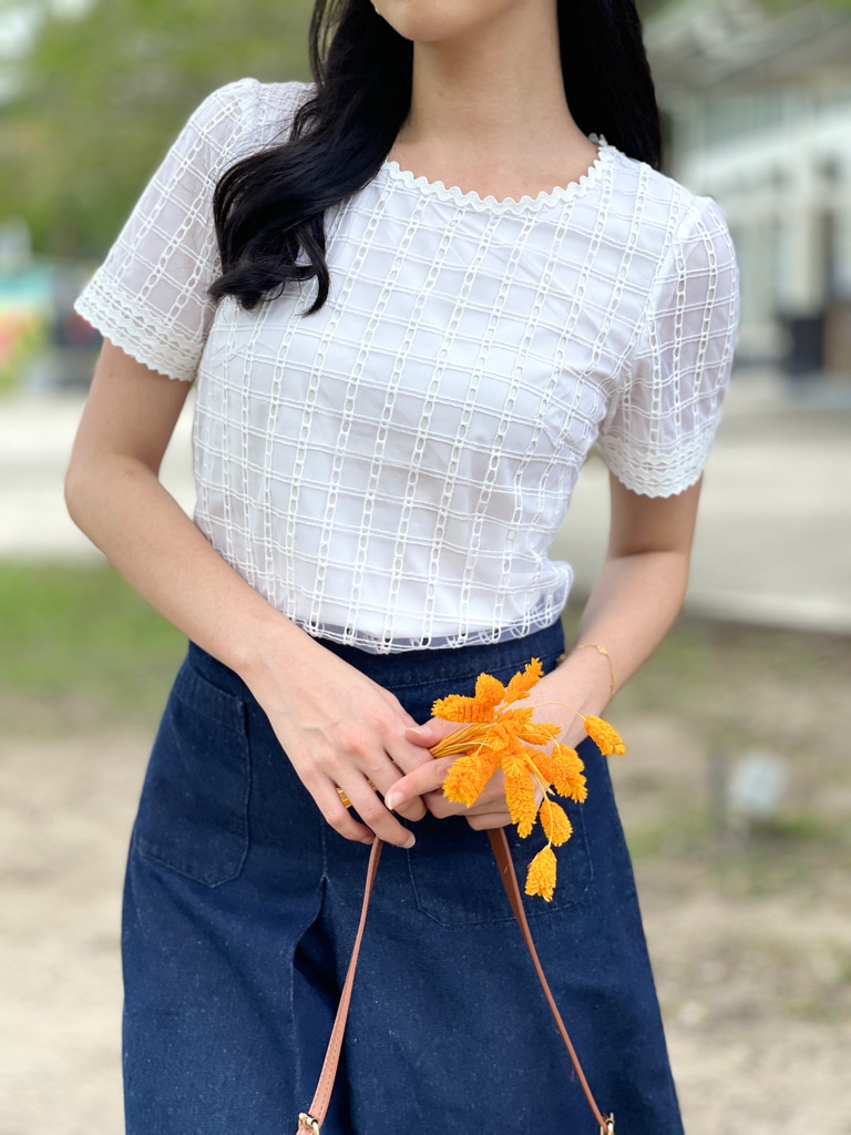 Effortlessly refined, subtly sweet. This blouse is crafted from soft grid-textured fabric with delicate scallop edges at the neckline and sleeves — a perfect blend of structure and femininity. The breathable weave gives a light, airy touch, making it ideal for both work and casual outings. Tuck it into a skirt for polished elegance or pair it with tailored pants for a chic everyday look.