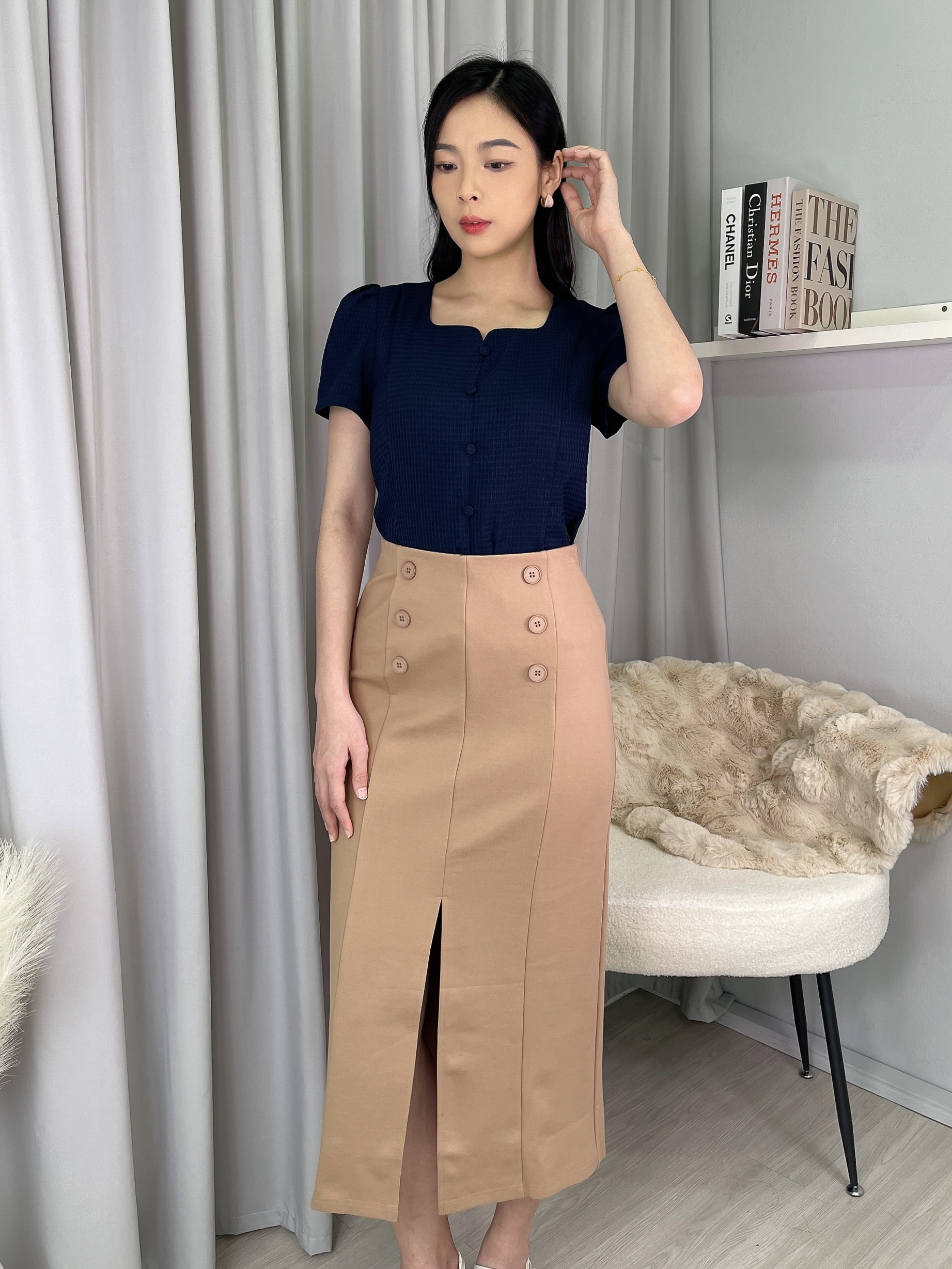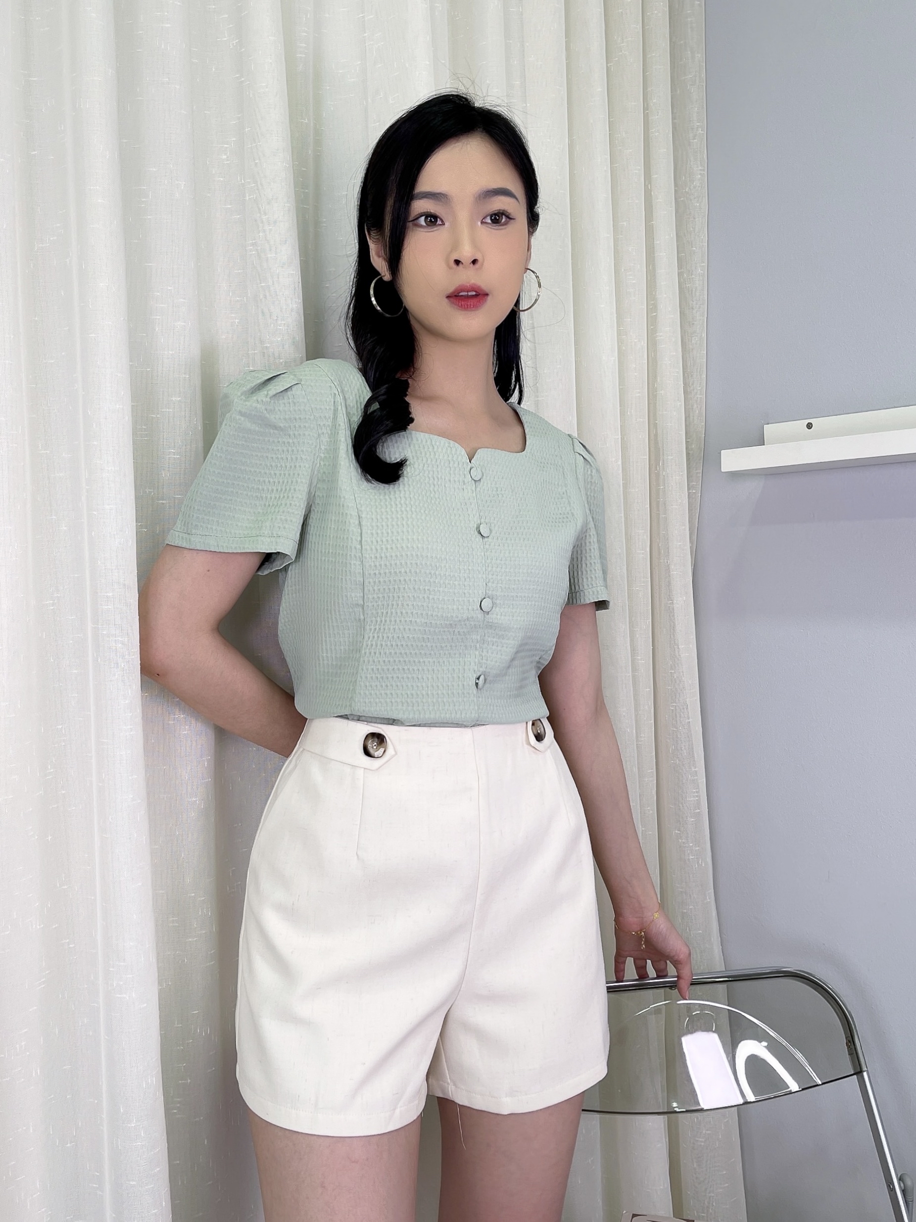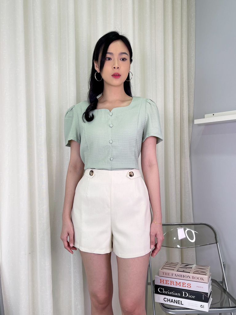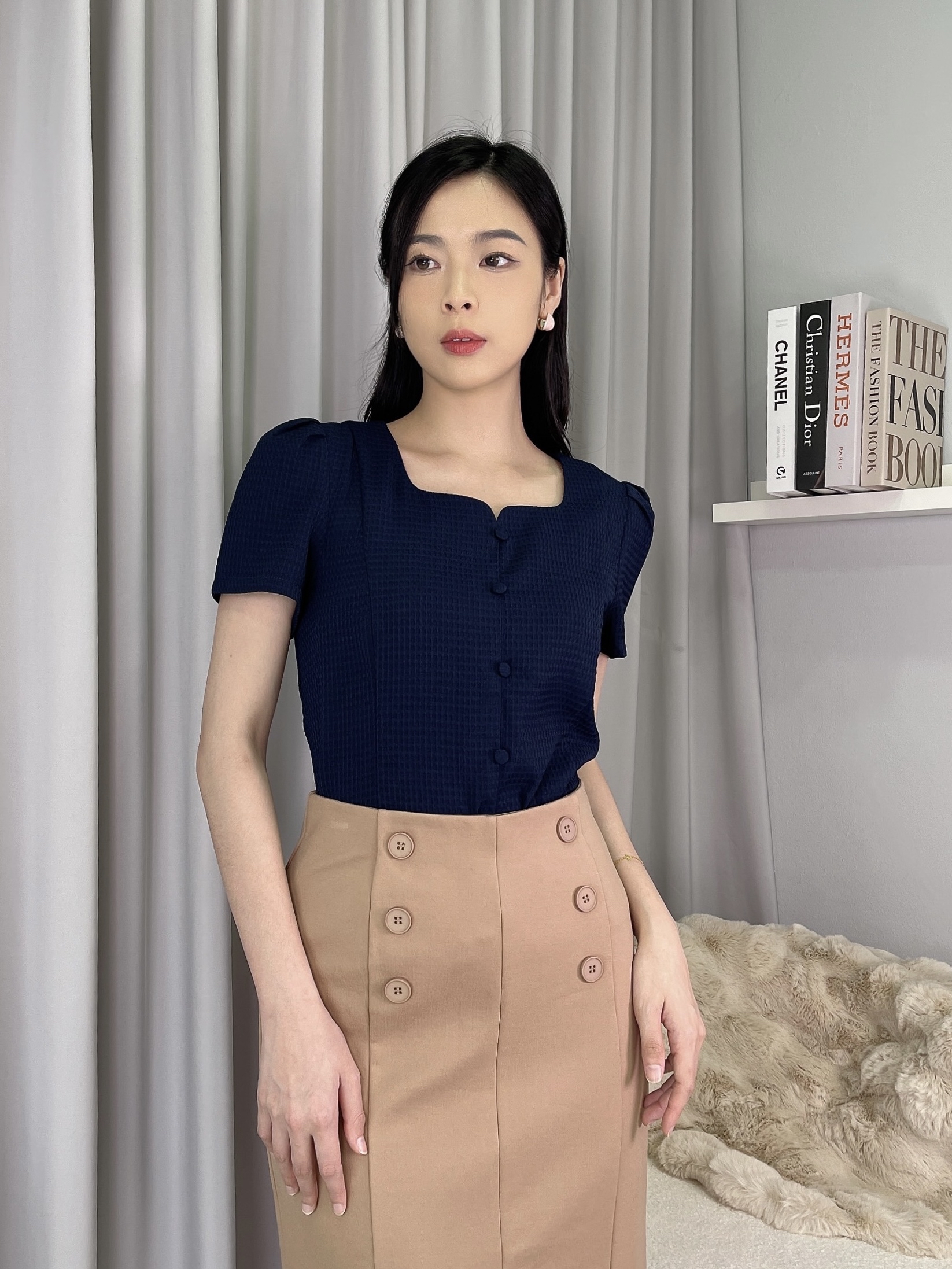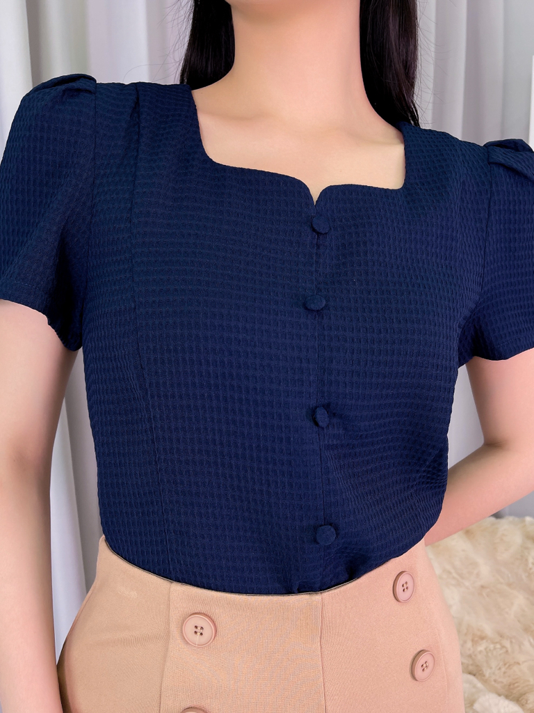 This vintage-inspired square-neck blouse is crafted from a lightweight textured fabric with delicate check patterns for a breathable and comfortable wear. The minimalist square neckline, paired with matching fabric-covered buttons, exudes an understated elegance. Slightly puffed shoulders enhance the silhouette, while the tailored cut offers a flattering fit. Perfect for both work and casual occasions, it pairs effortlessly with high-waisted trousers or skirts for a polished yet feminine look.