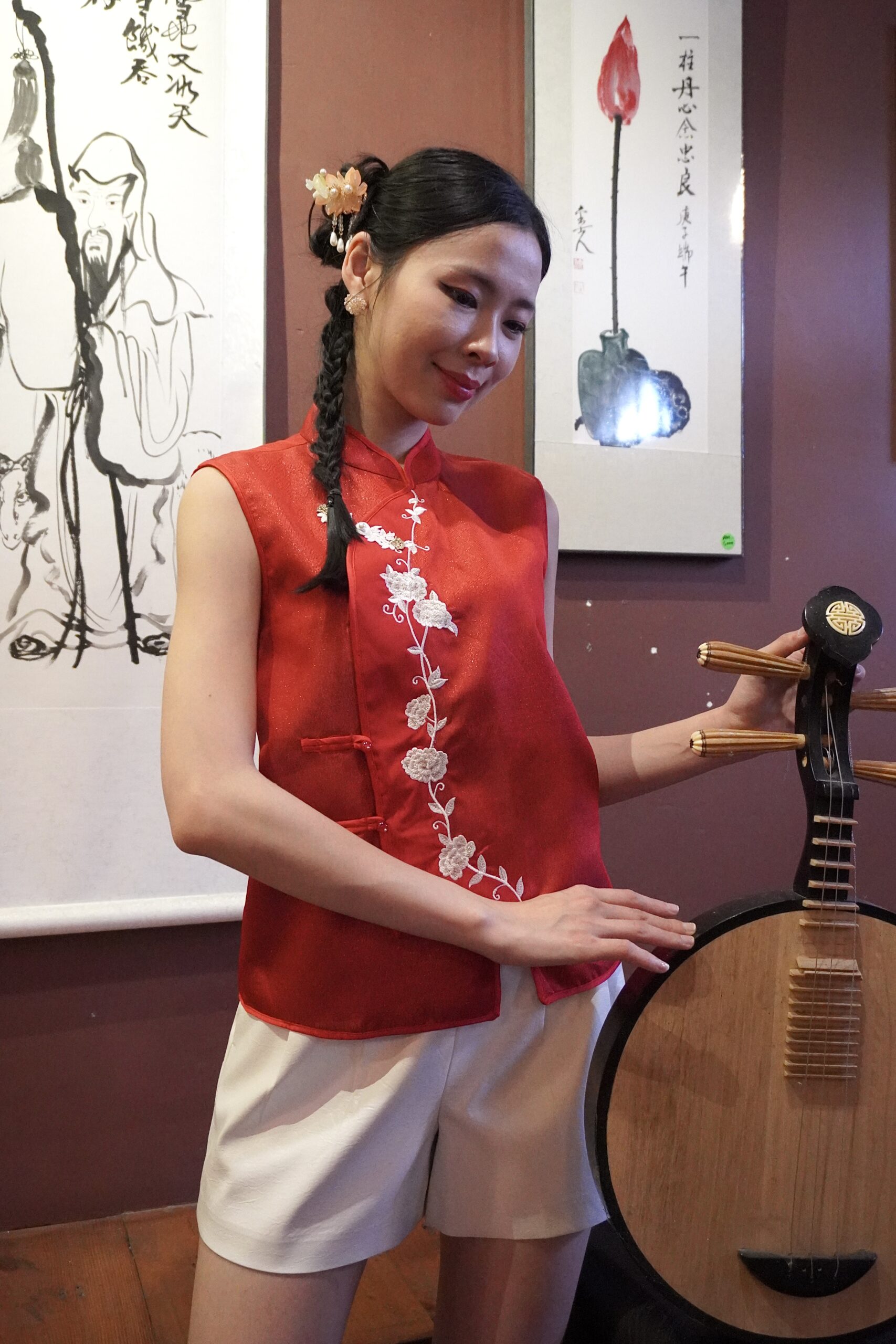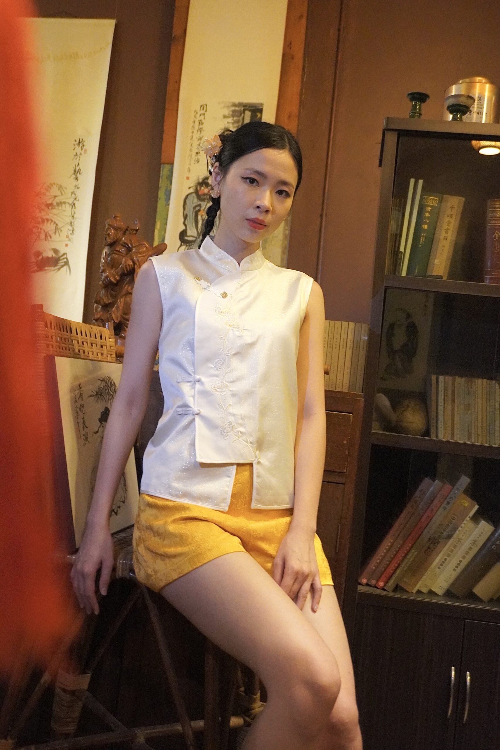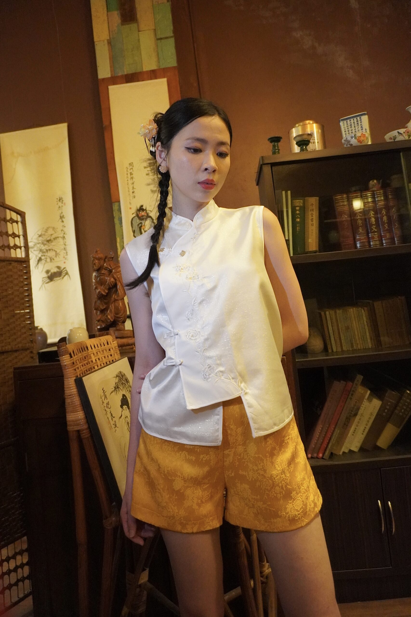 This sleeveless qipao-inspired top features a luminous with delicate embroidery and traditional frog closures. The overlapping hemline adds a touch of modern flair, making it the perfect blend of classic oriental charm and contemporary style.