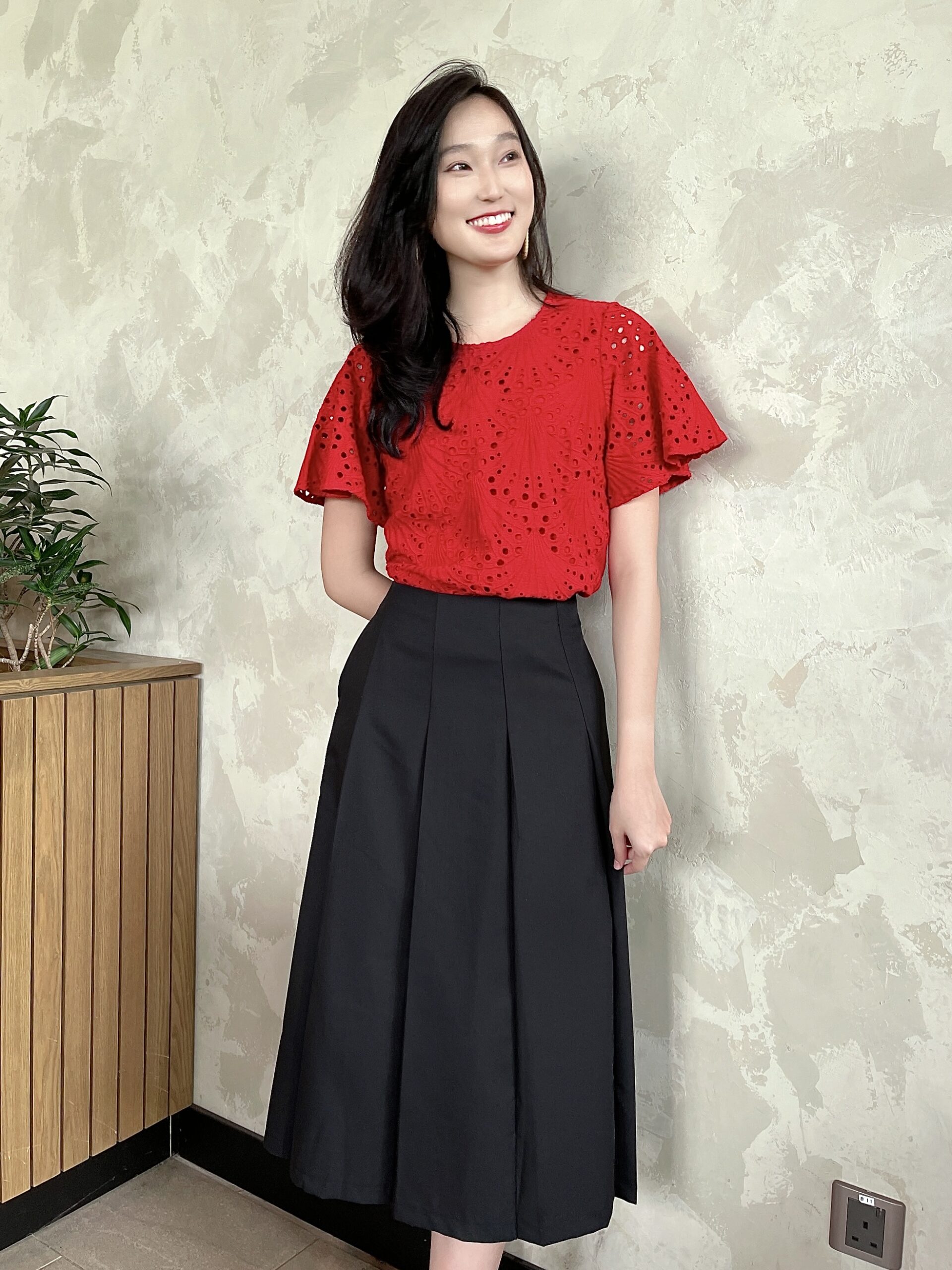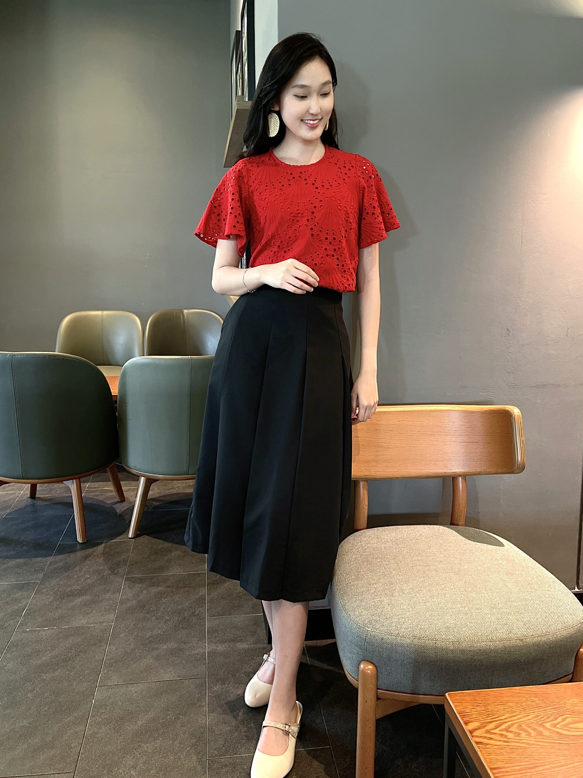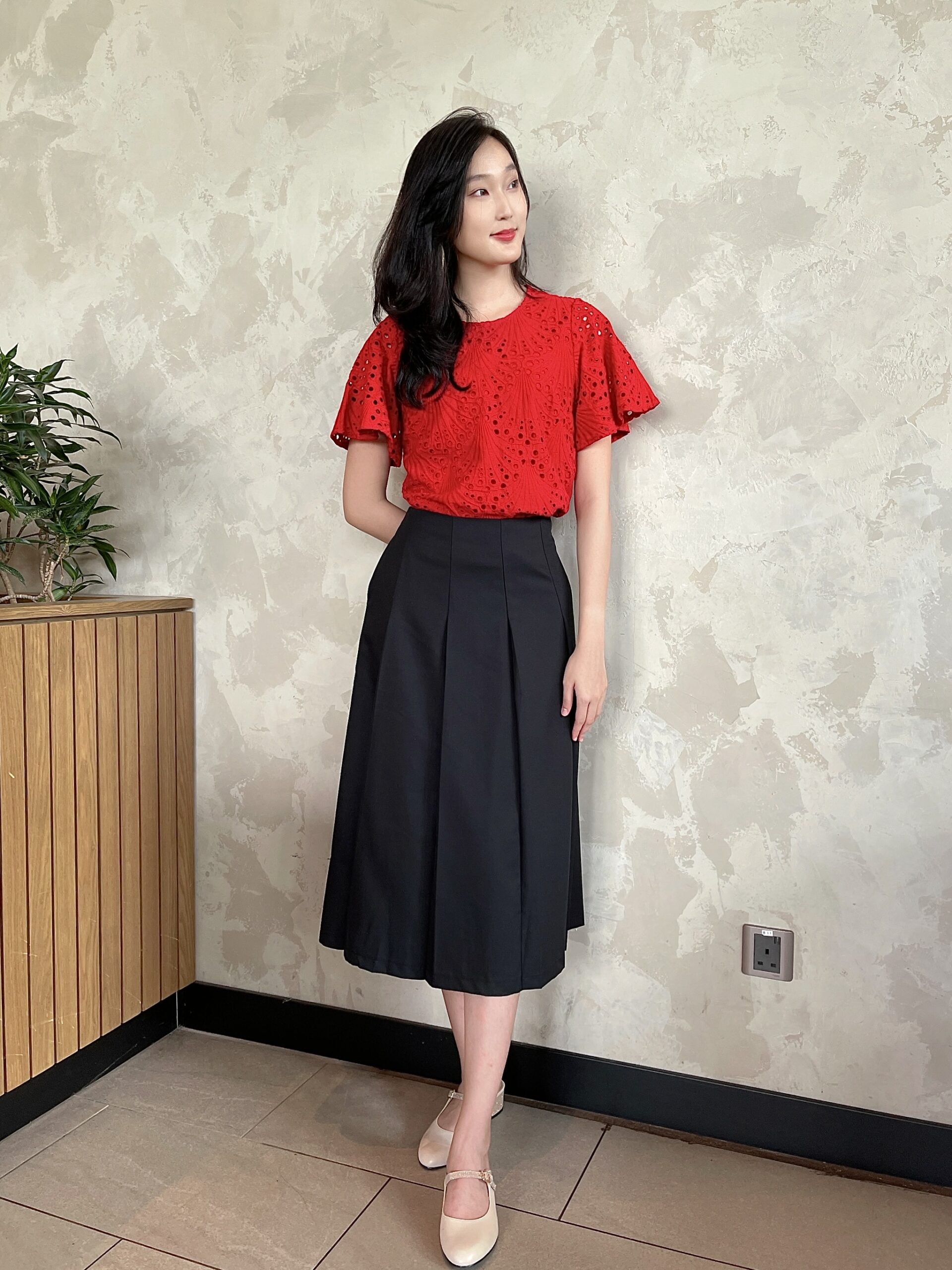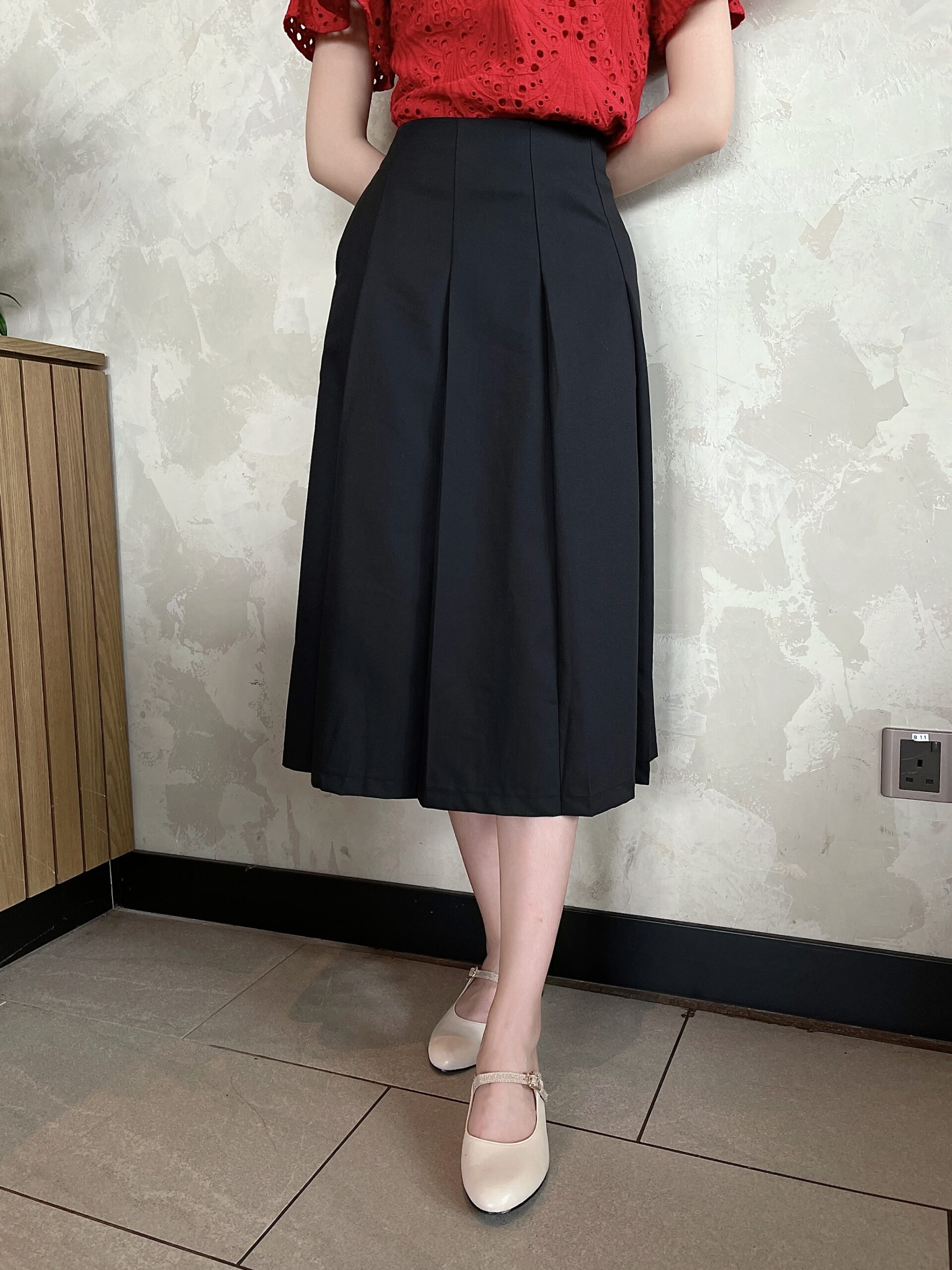 A chic and versatile midi skirt with a flattering high-waist cut and structured A-line silhouette. The subtle pleats add movement and elegance, making it suitable for both workdays and weekend outings.