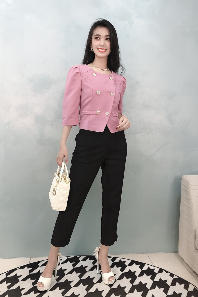 Clean lines with a modern twist — these ankle-length slim trousers are tailored to flatter. Featuring a subtle cuffed hem with decorative button detail, they balance professionalism with a playful charm. Crafted from smooth, structured fabric that drapes neatly without clinging, it’s the ultimate go-to for both office days and dressy nights. Pair with a cropped blazer or a fitted blouse for effortless elegance.