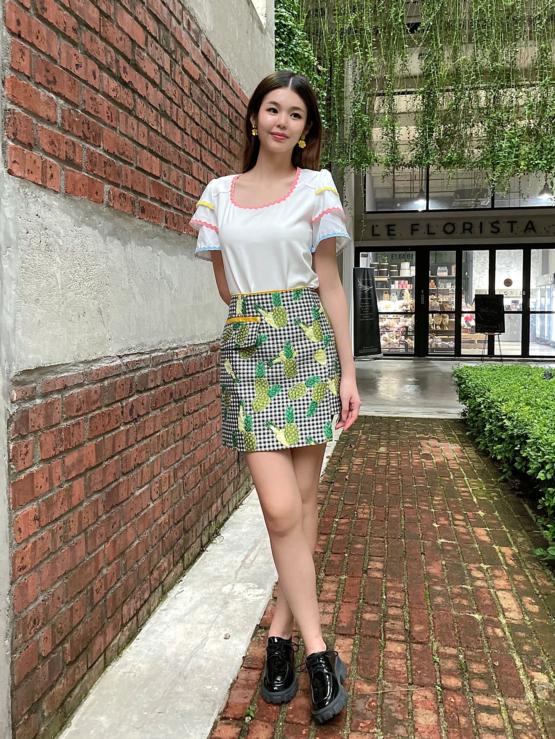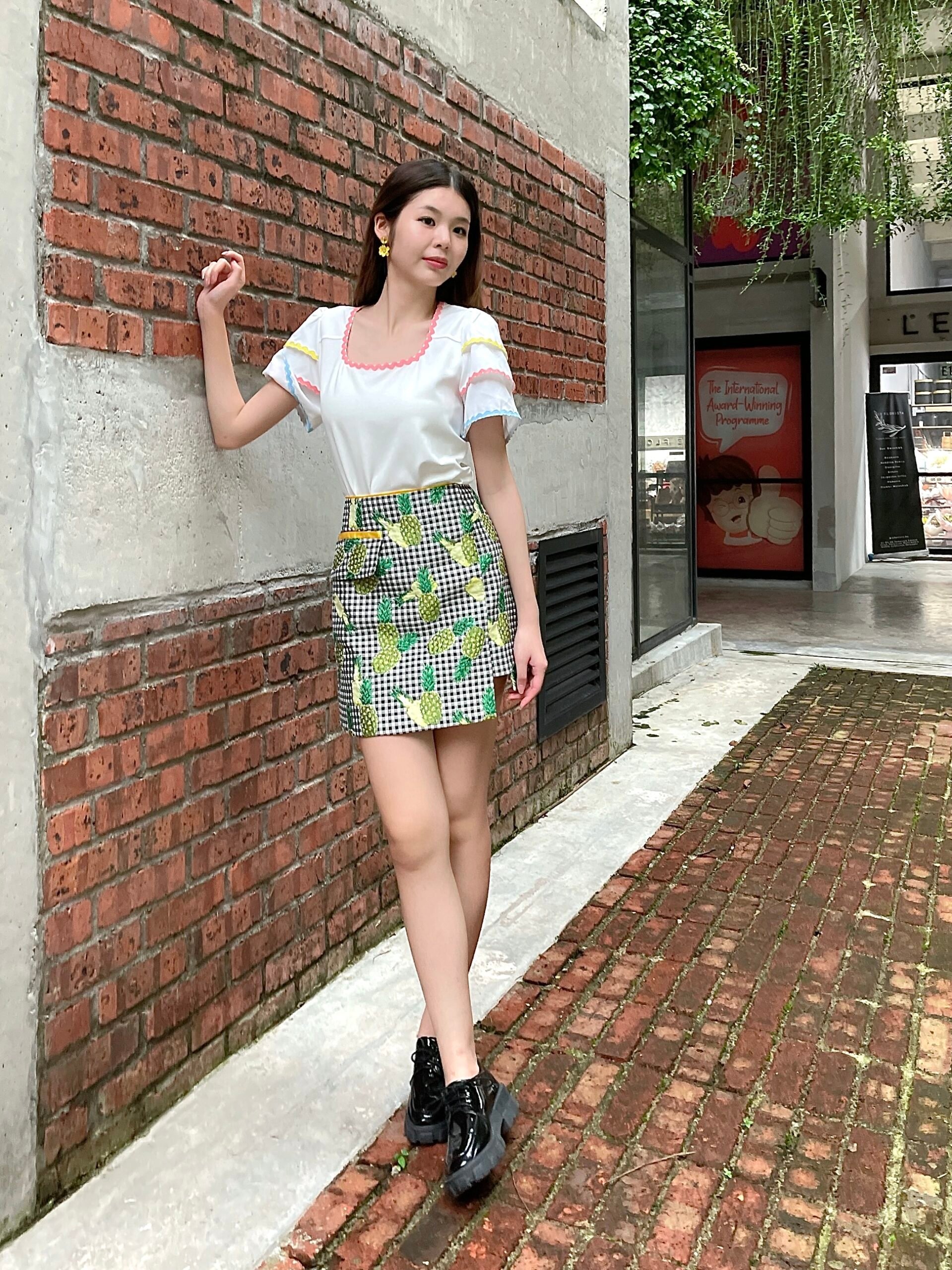 The Square-Neck Puff Sleeved Top features a chic square neckline that flatters the collarbone for a refined look. Designed with playful puff sleeves and colorful wavy trims, it adds a fresh, youthful charm. Perfect to pair with high-waisted skirts or jeans, this top brings a stylish and breezy vibe to your summer wardrobe.