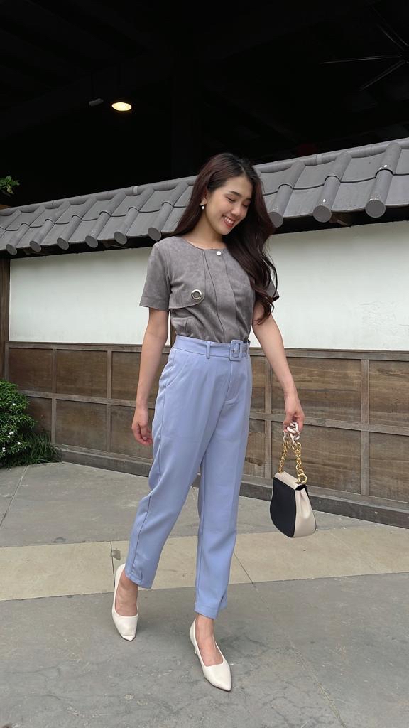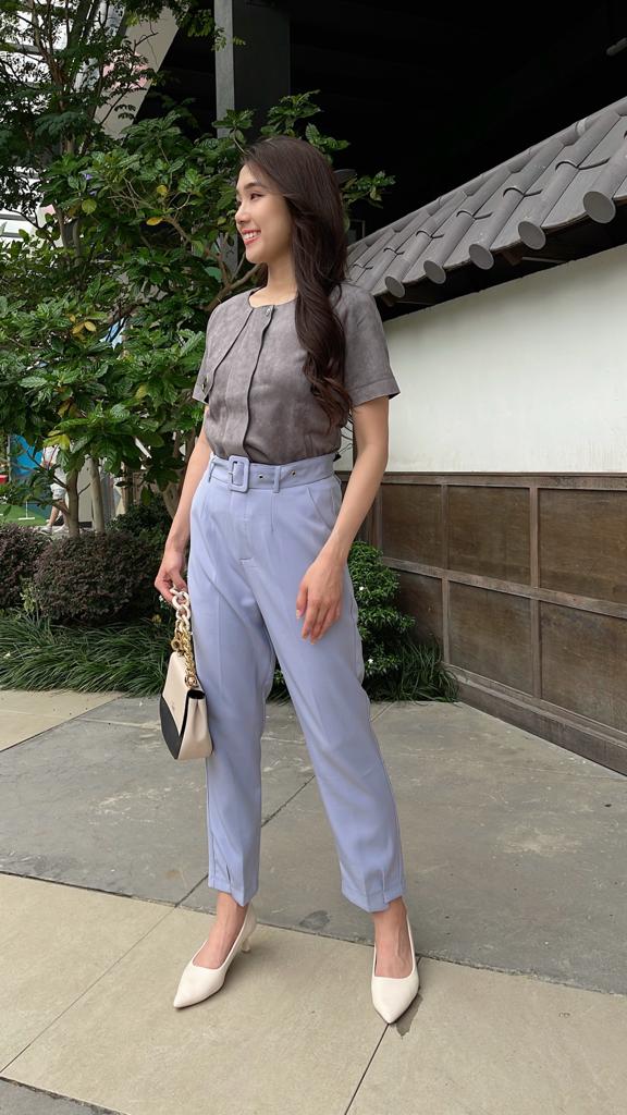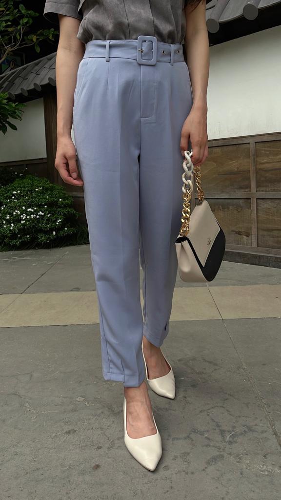 These high-waist tailored pants feature a clean, structured silhouette that elongates the legs, with subtle side slits at the hem adding a touch of movement. Comes with a detachable matching belt for versatile styling. Crafted from crisp fabric that holds its shape, making it perfect for work, casual outings, or date nights—effortlessly balancing elegance and confidence.