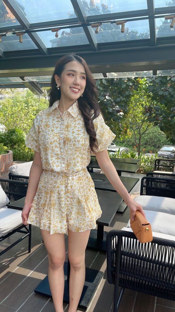 Step into summer with elegance — these jacquard shorts feature a soft golden floral print on a structured fabric, giving off a fresh, resort-ready vibe. The high-waisted design and soft front pleats flatter your waistline, while the clean hem adds a tailored finish. Pair with matching tops or crisp white blouses for a graceful everyday look.