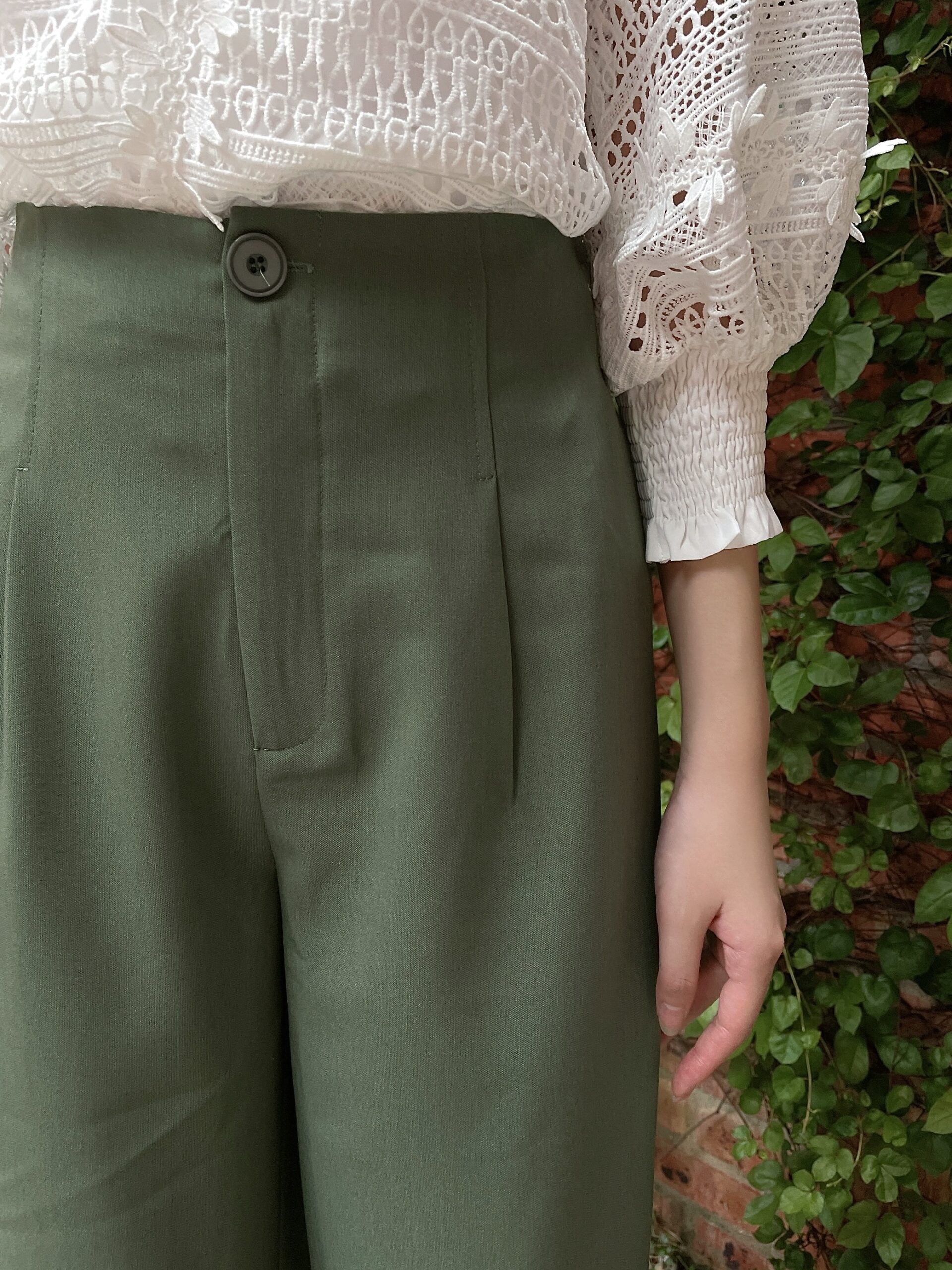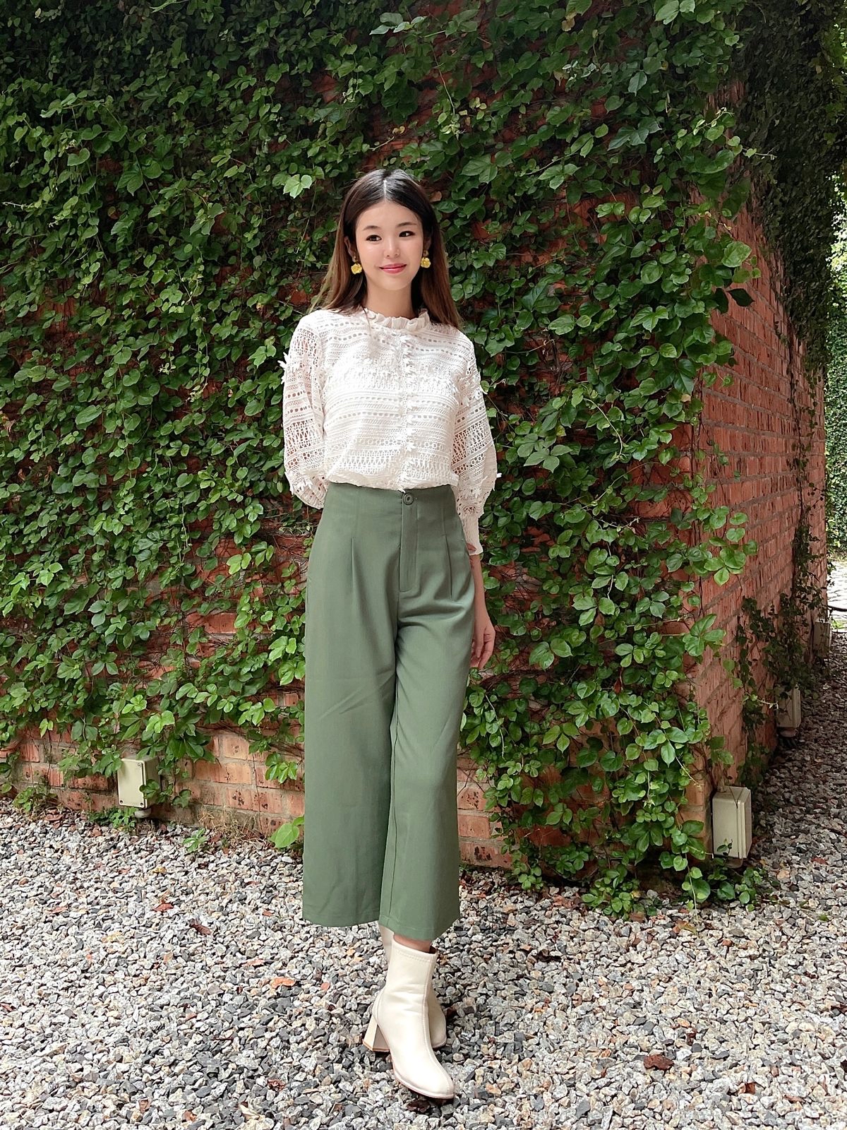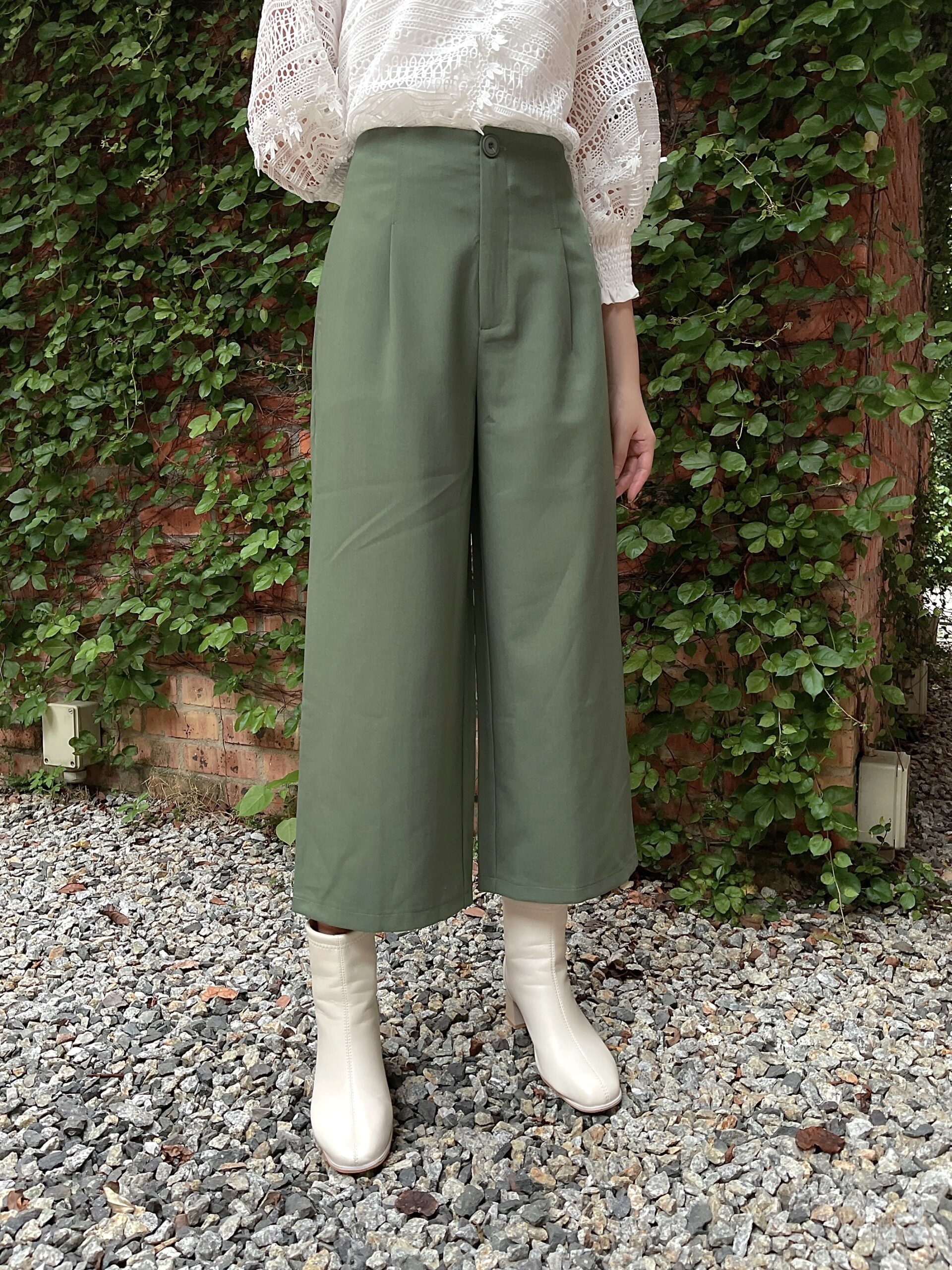 These sage green wide-leg pants feature a high-waist cut that elongates the legs and offers a flattering silhouette. The cropped length adds a modern edge, making them perfect for both casual and semi-formal styling.