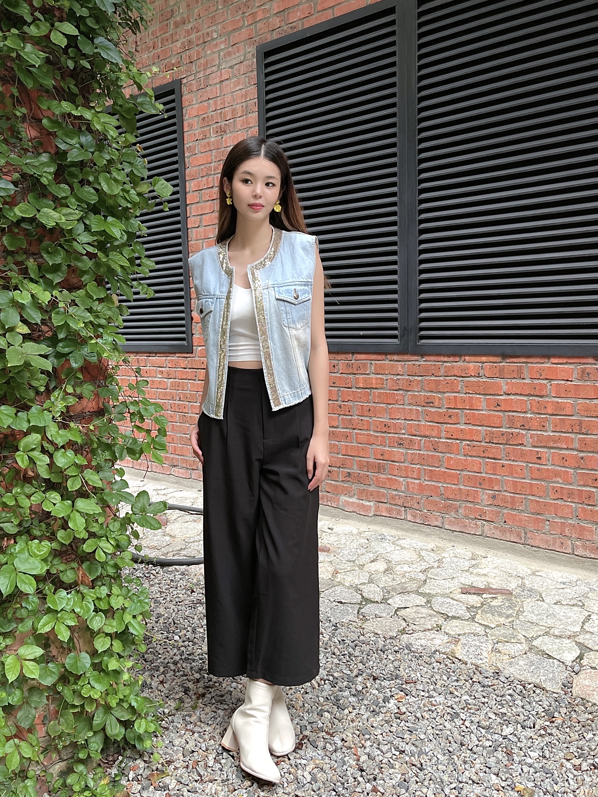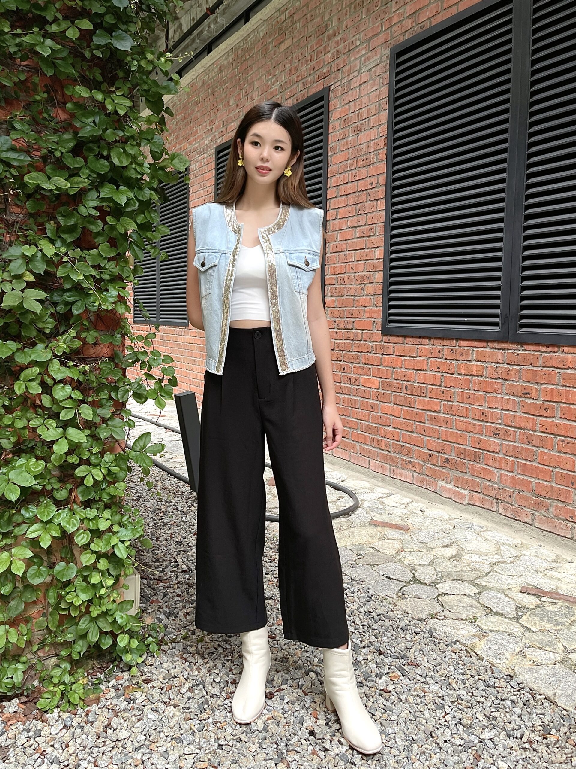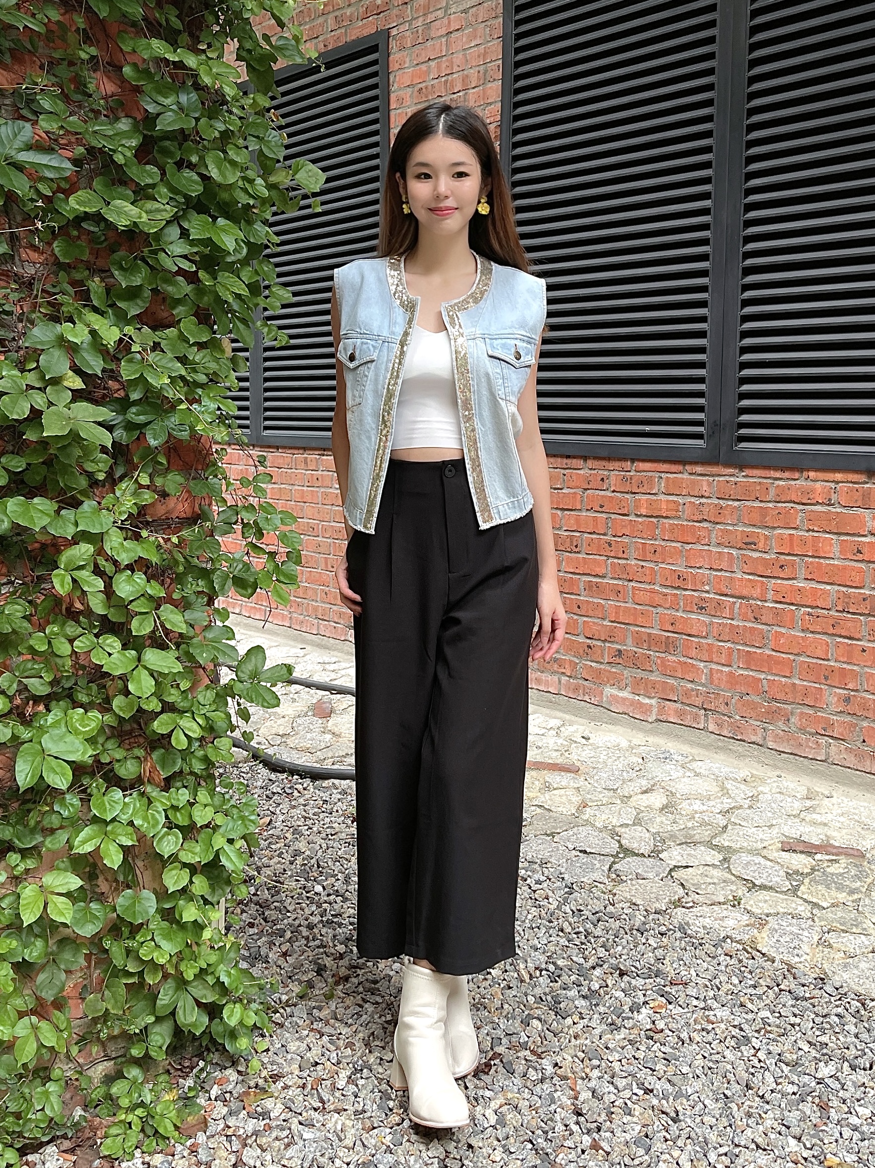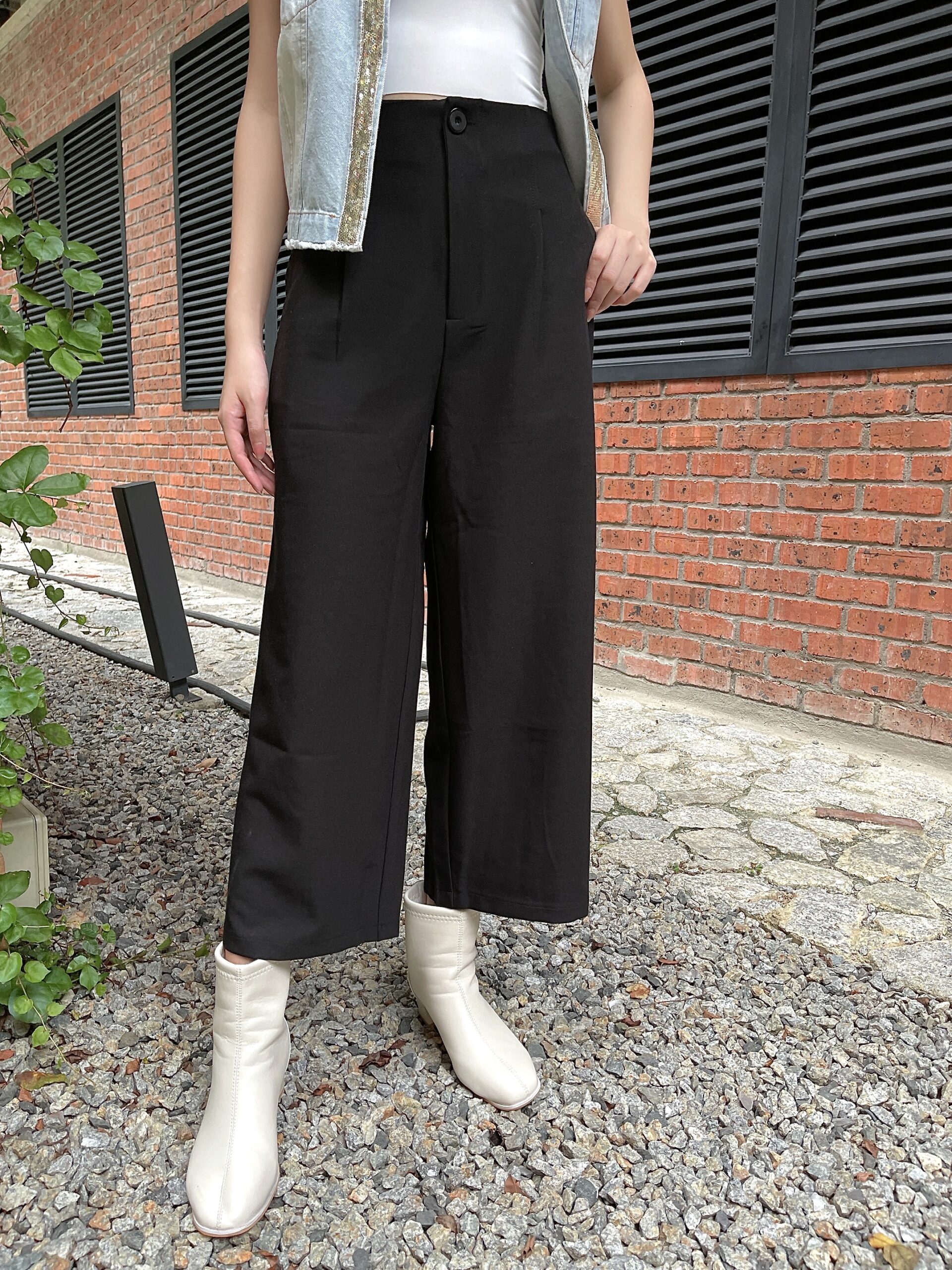 These sage green wide-leg pants feature a high-waist cut that elongates the legs and offers a flattering silhouette. The cropped length adds a modern edge, making them perfect for both casual and semi-formal styling.