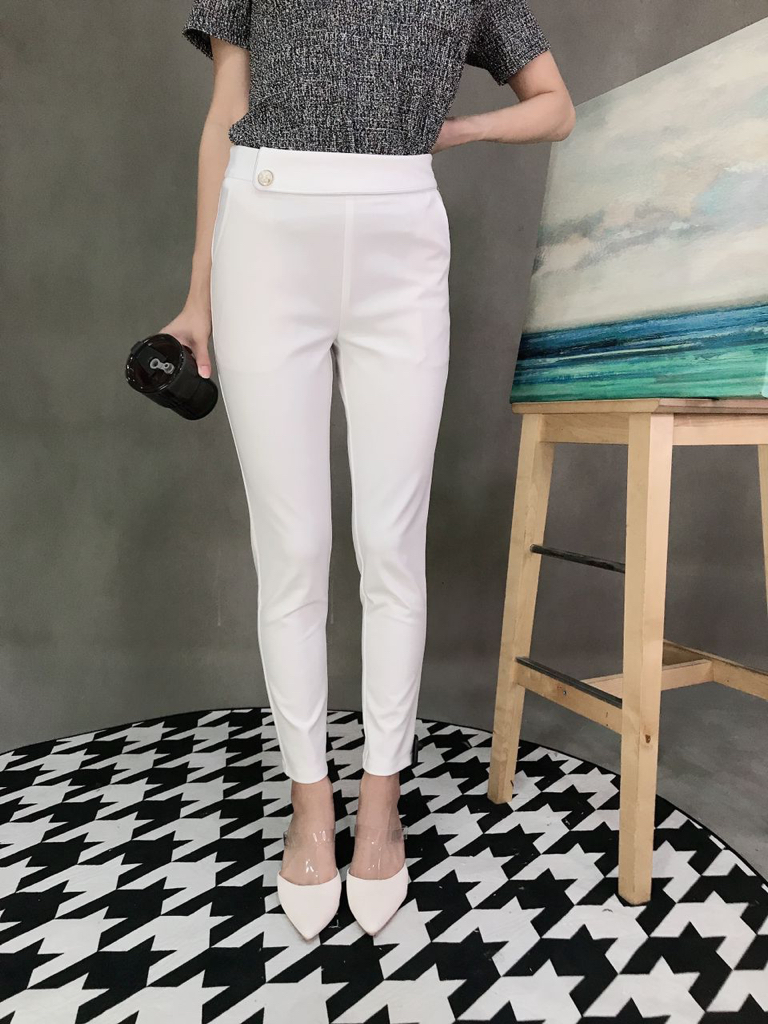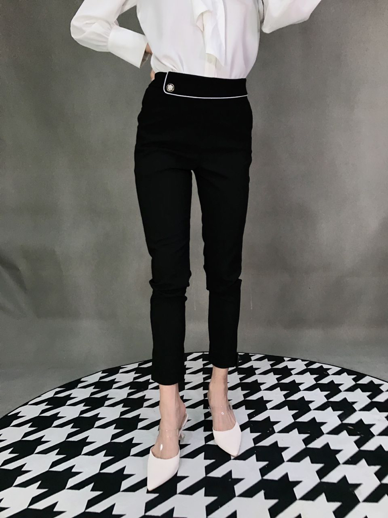 Elevate your work-to-weekend wardrobe with these high-waist slim-fit pants, featuring a sleek front seam and a signature pearl button on the side waistband. Designed in a structured stretch fabric, they shape your silhouette while ensuring day-long comfort. A subtle contrast piping on the black version adds a polished finish. Available in timeless White and Classic Black – perfect for the modern woman who values elegance with a hint of edge.