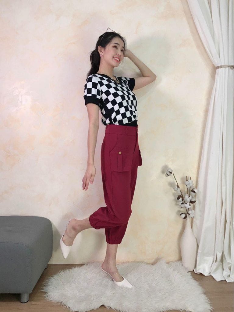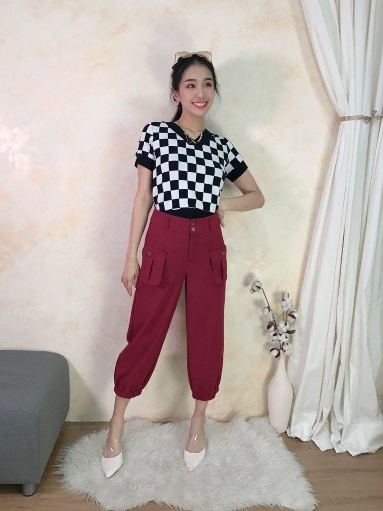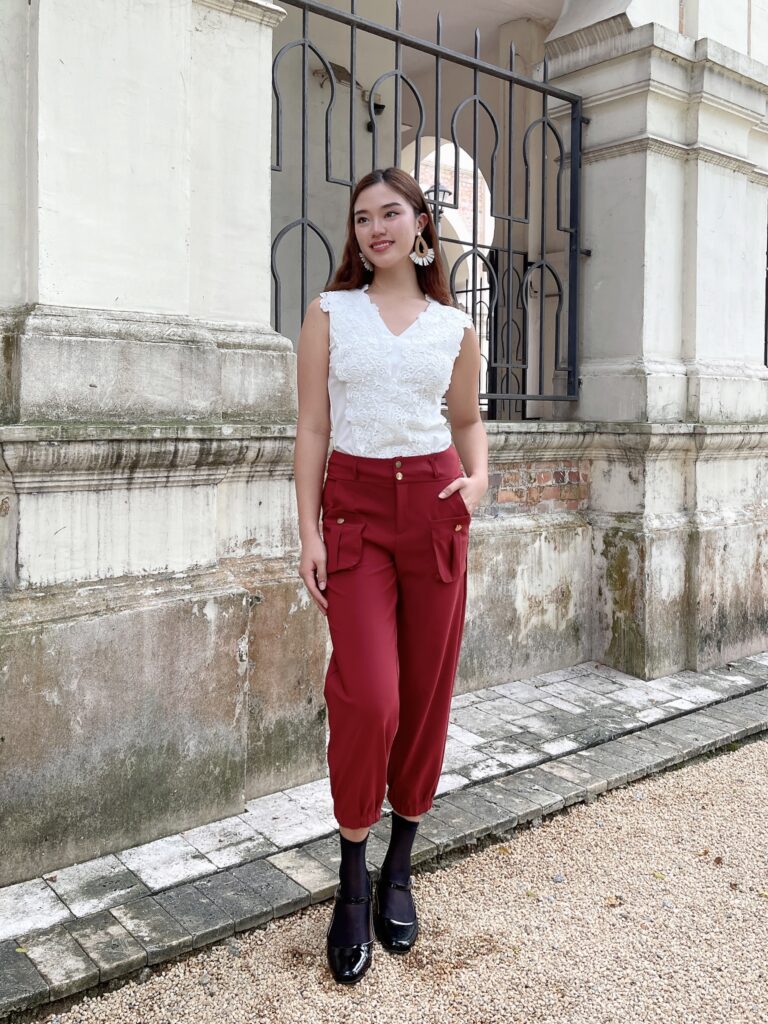 These are high-waisted cropped cargo pants in a rich wine-red tone, featuring flap pockets with gold button accents and a tapered cuffed hem. The structured yet relaxed fit blends elegance with utility, making them perfect for both casual and semi-formal pairings.