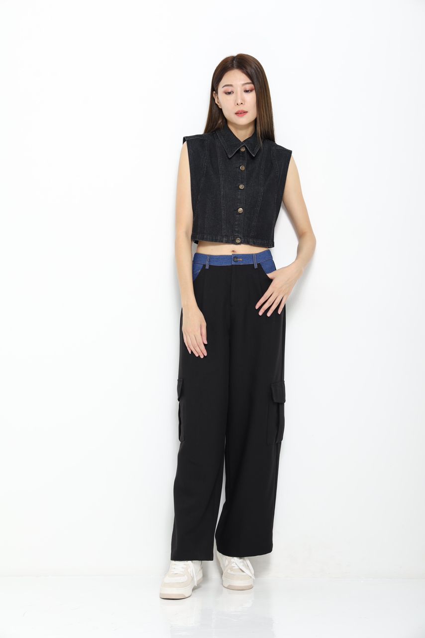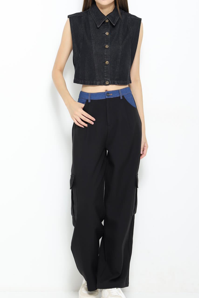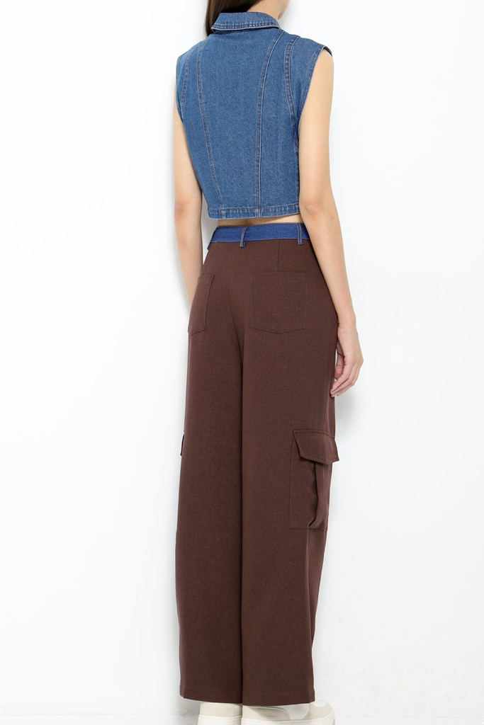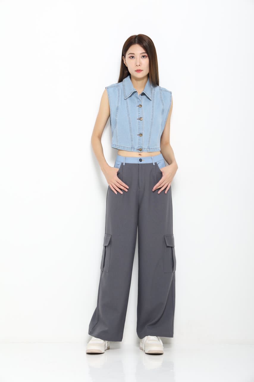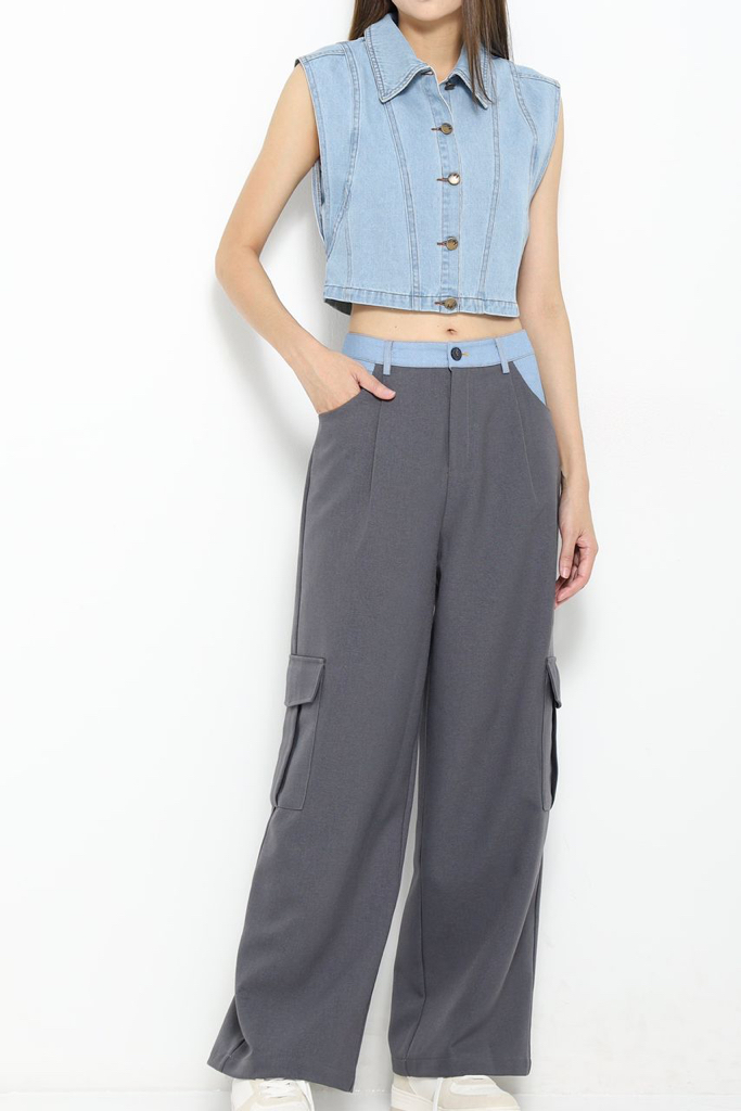 These utility-inspired cargo pants blend laid-back style with functional flair. Designed with a wide-leg silhouette and contrast denim waistband, they feature side cargo pockets and a modern high-rise cut. Easy to pair with crop tops or relaxed shirts, they’re perfect for off-duty looks or casual street styling.
