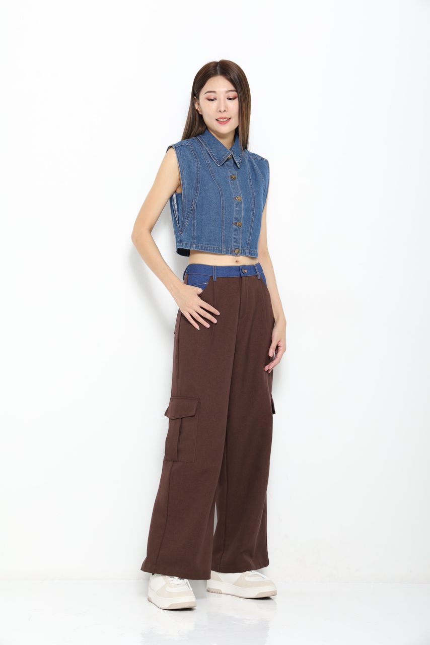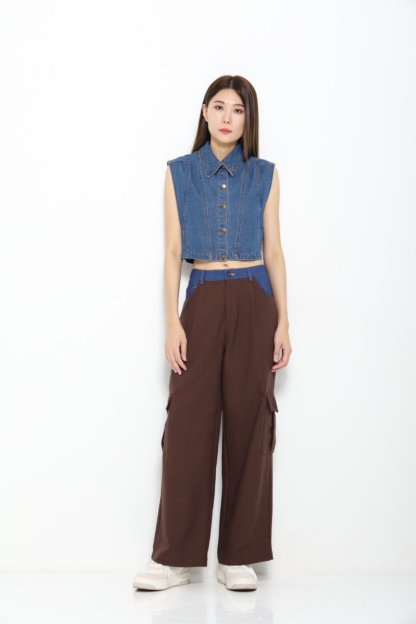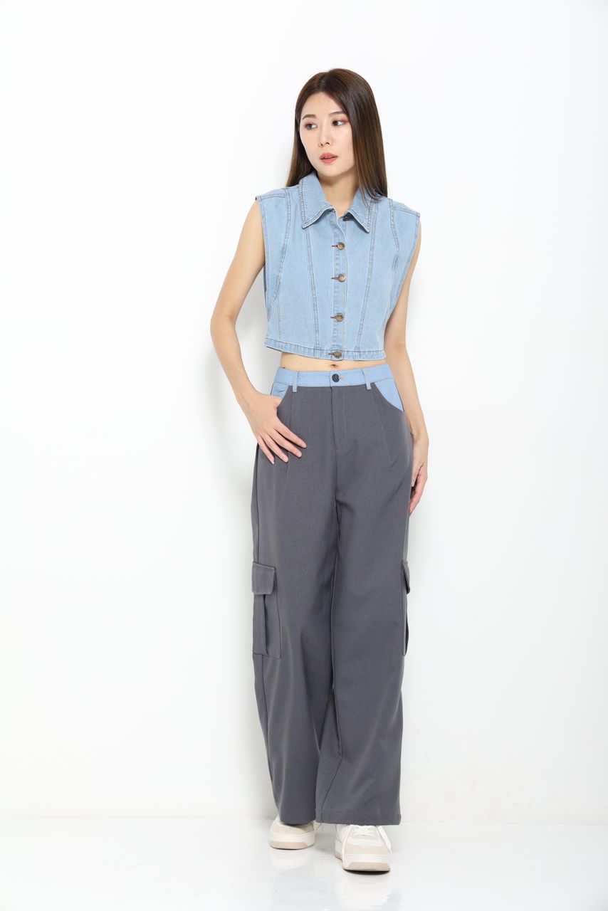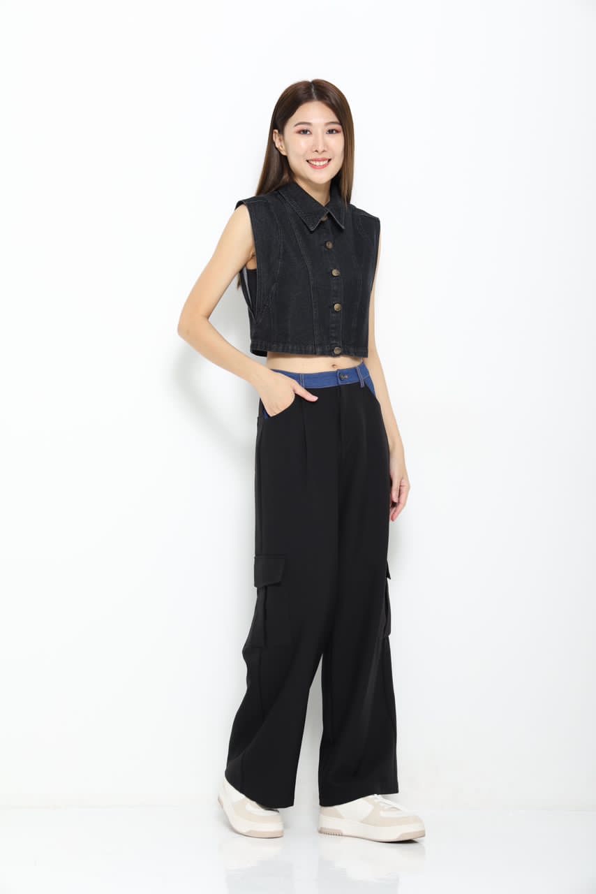 These utility-inspired cargo pants blend laid-back style with functional flair. Designed with a wide-leg silhouette and contrast denim waistband, they feature side cargo pockets and a modern high-rise cut. Easy to pair with crop tops or relaxed shirts, they’re perfect for off-duty looks or casual street styling.