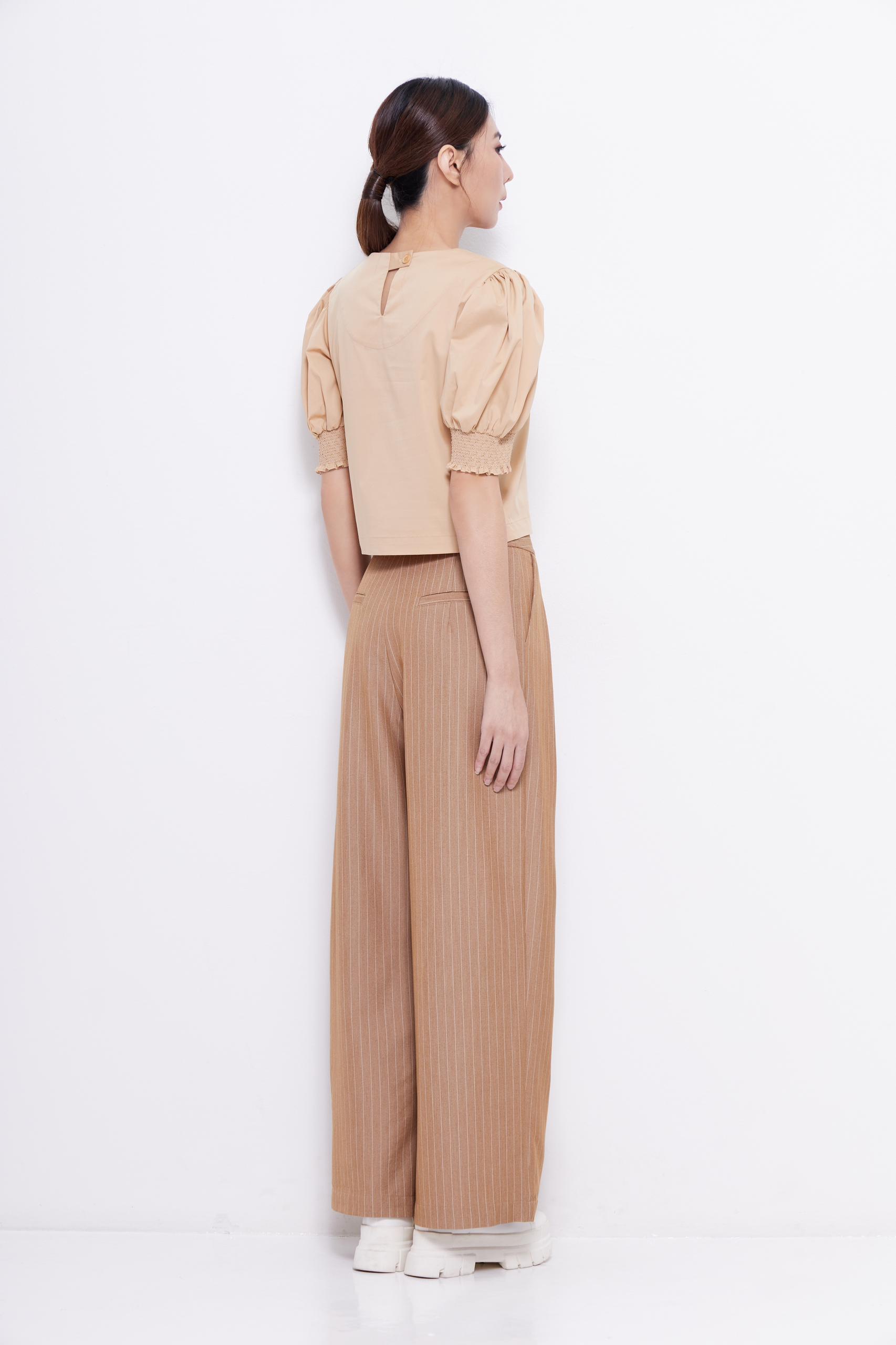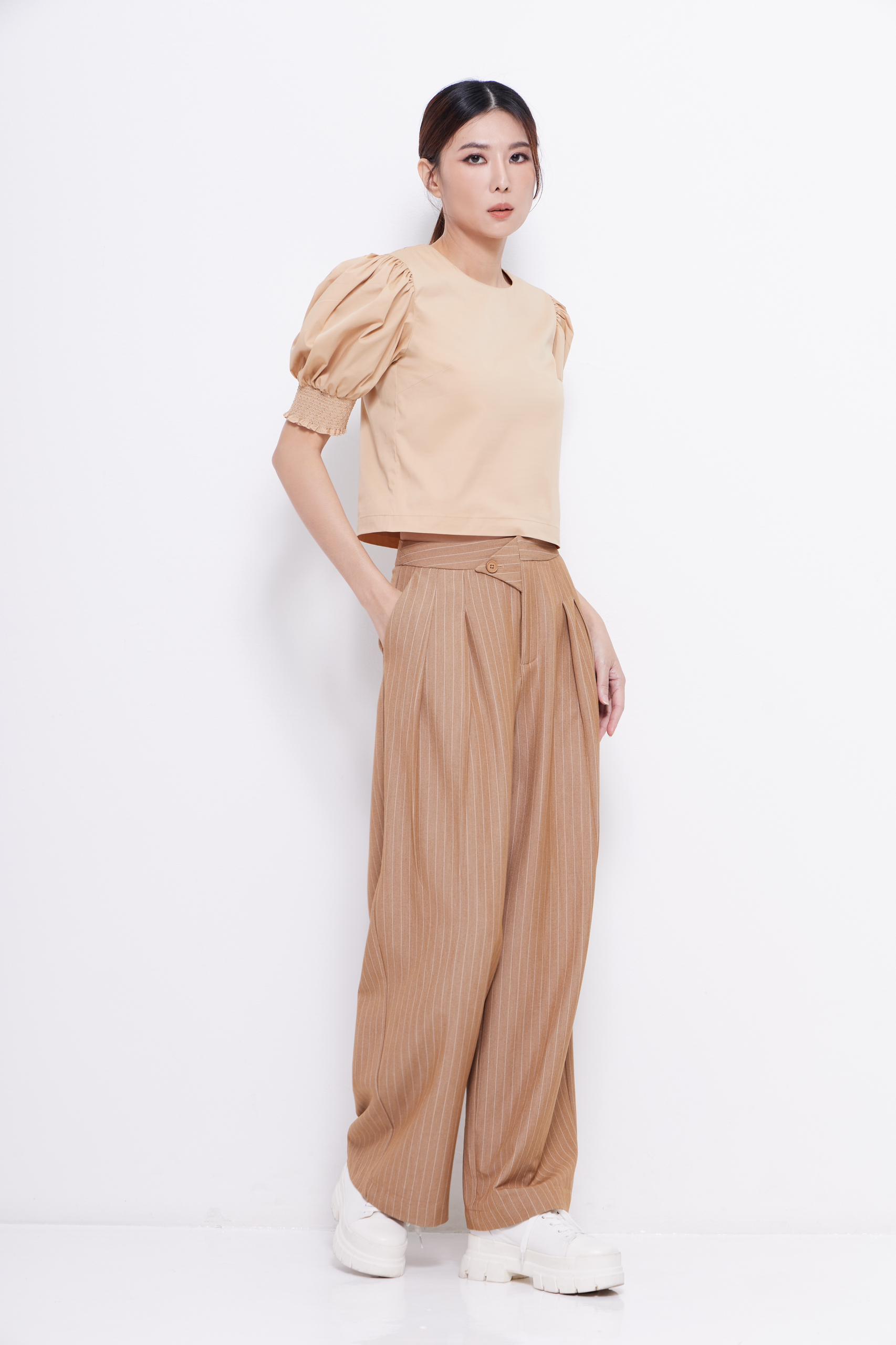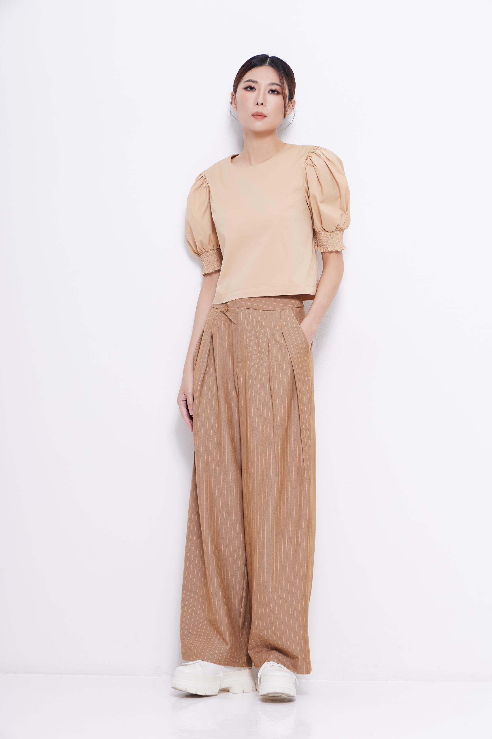 Chic and breezy, these caramel wide-leg trousers elevate your everyday look with understated elegance. The soft drape and subtle pinstripe design create a long and lean silhouette, while the pleated front adds a tailored finish.