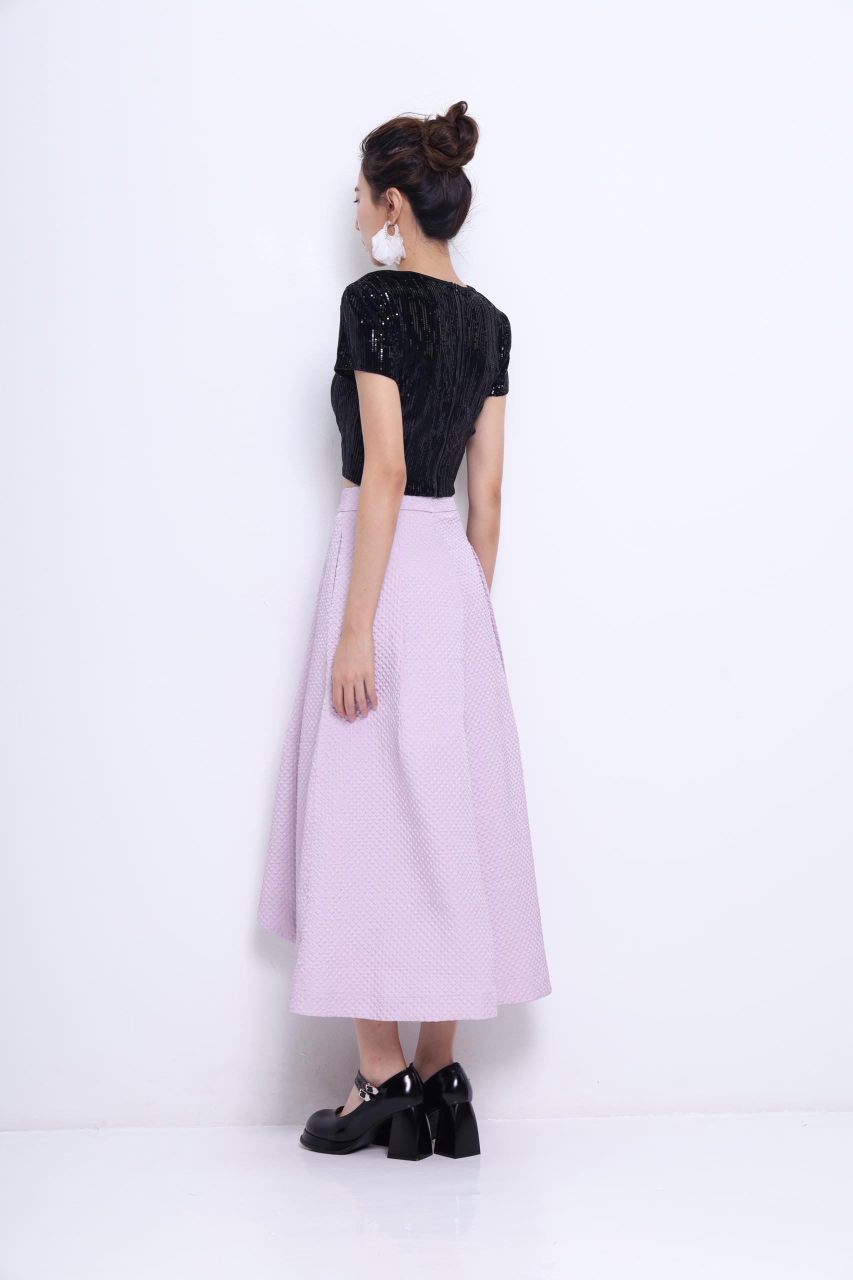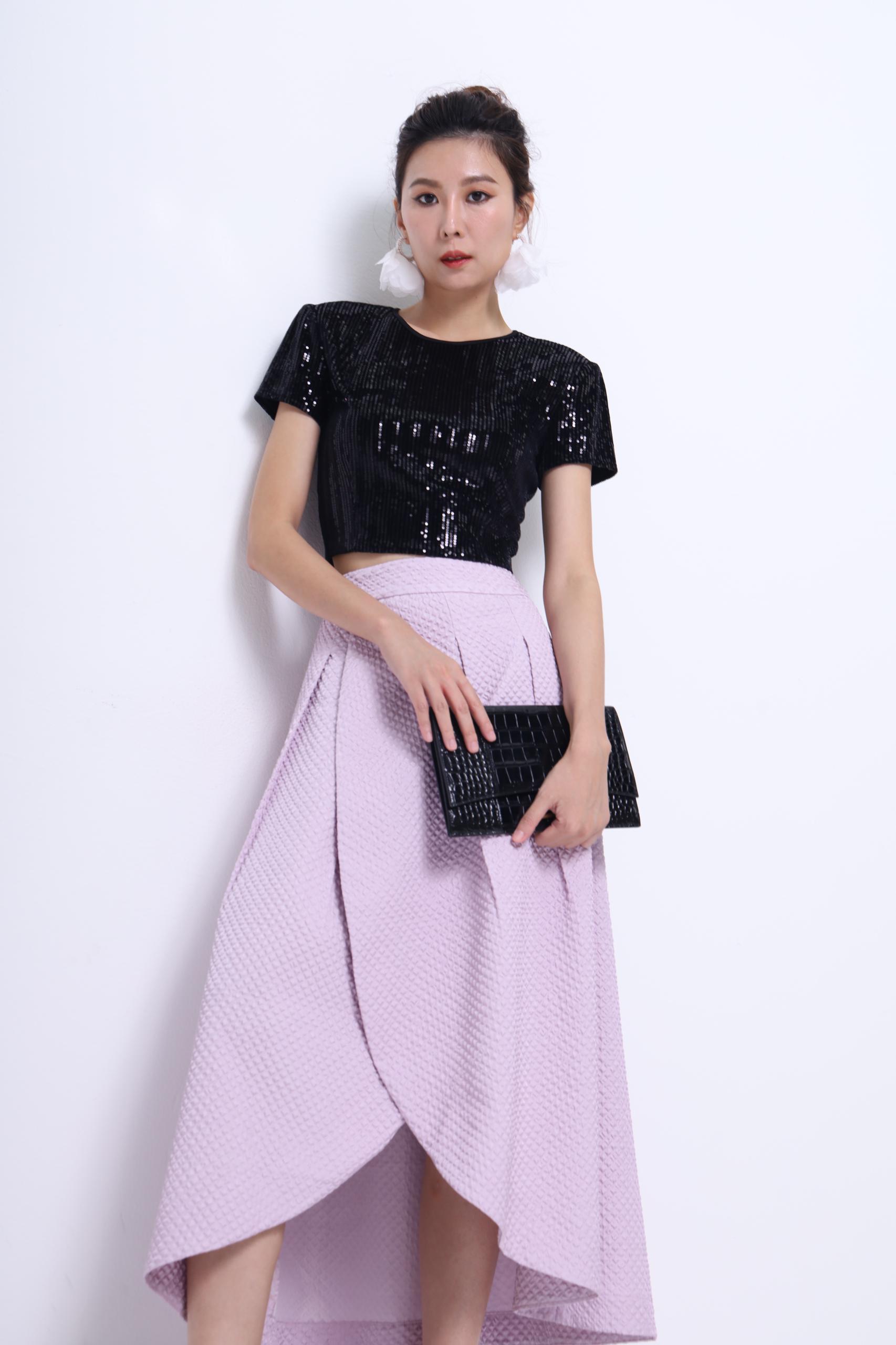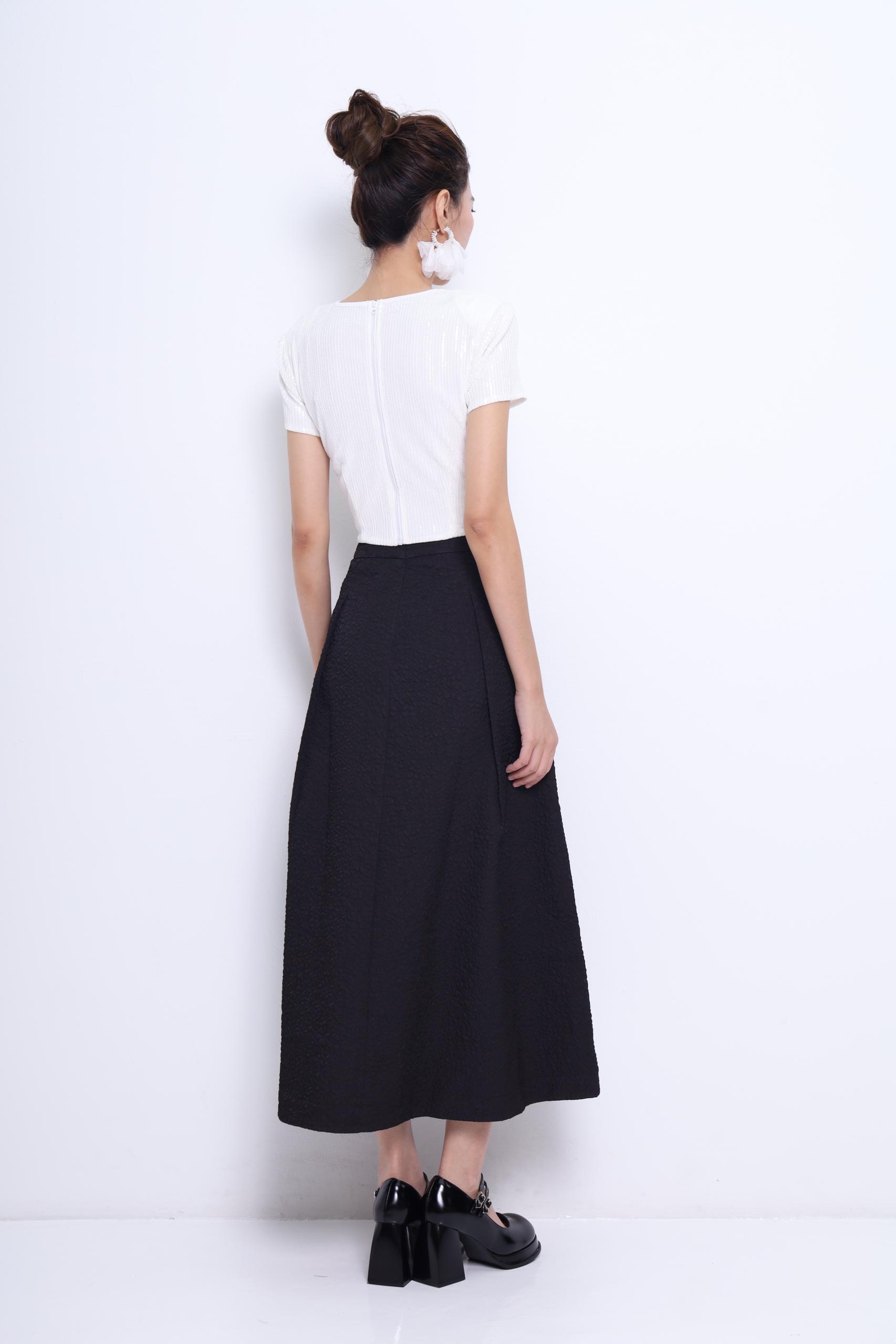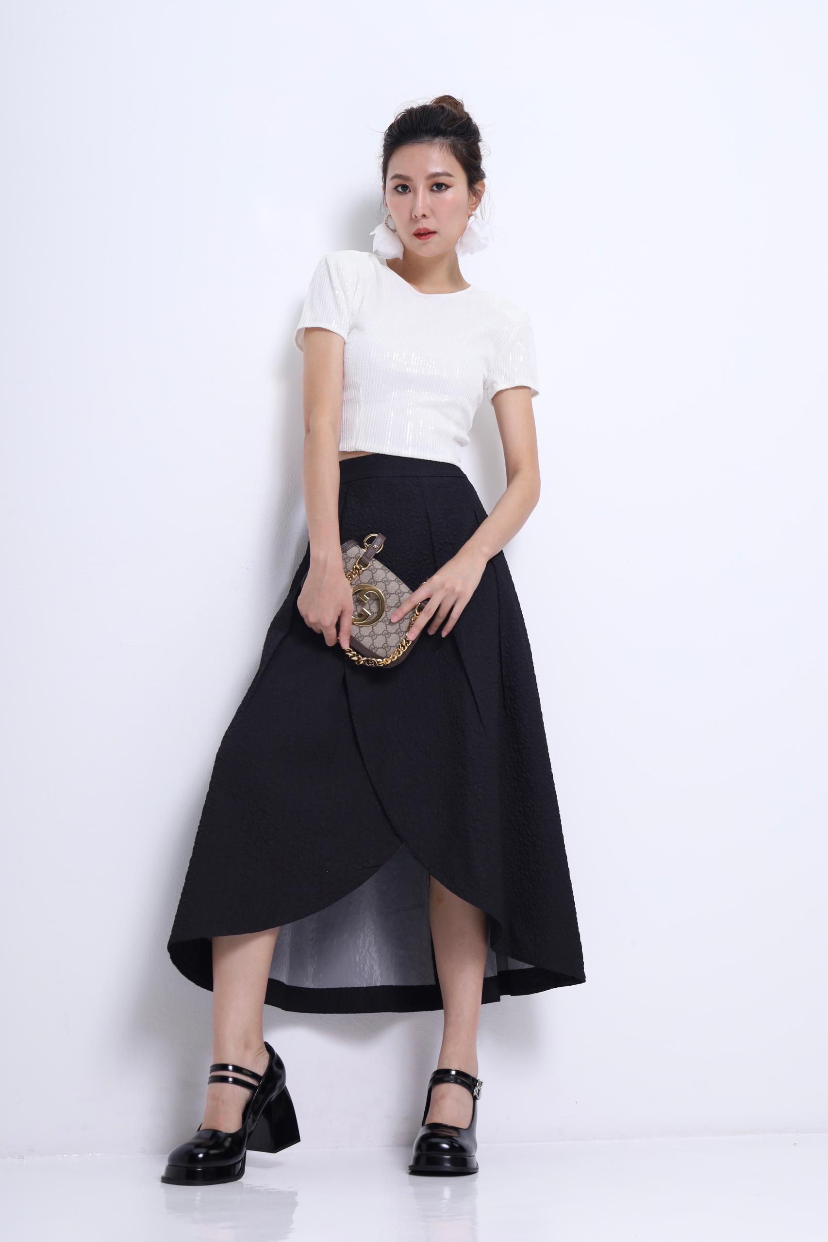 An elegant high-low tulip skirt crafted in a rich textured fabric that adds subtle volume and dimension. The overlapping front design mimics a wrap effect, providing graceful movement and a sophisticated silhouette. Perfect for special occasions or dressed-up daywear.