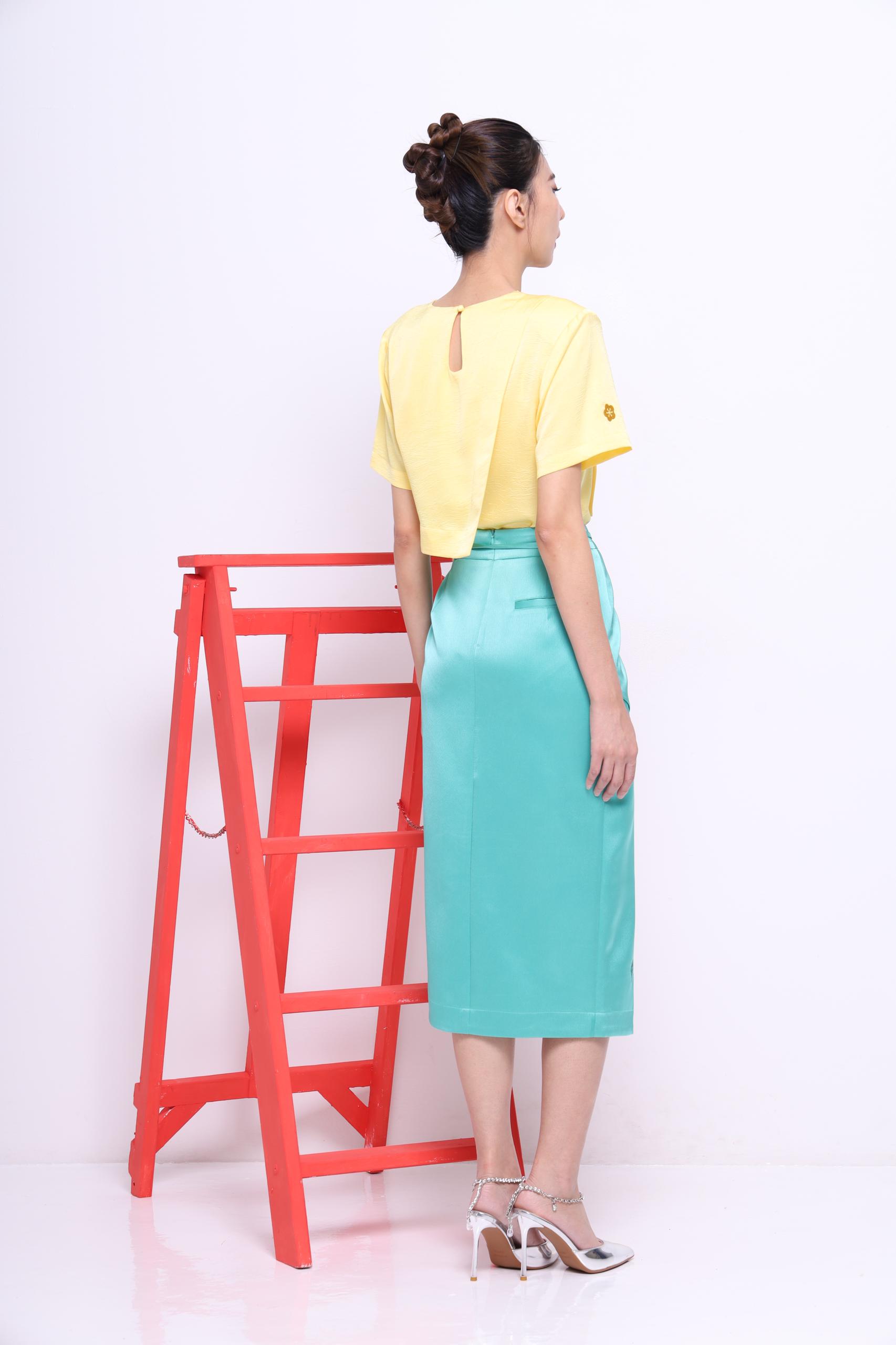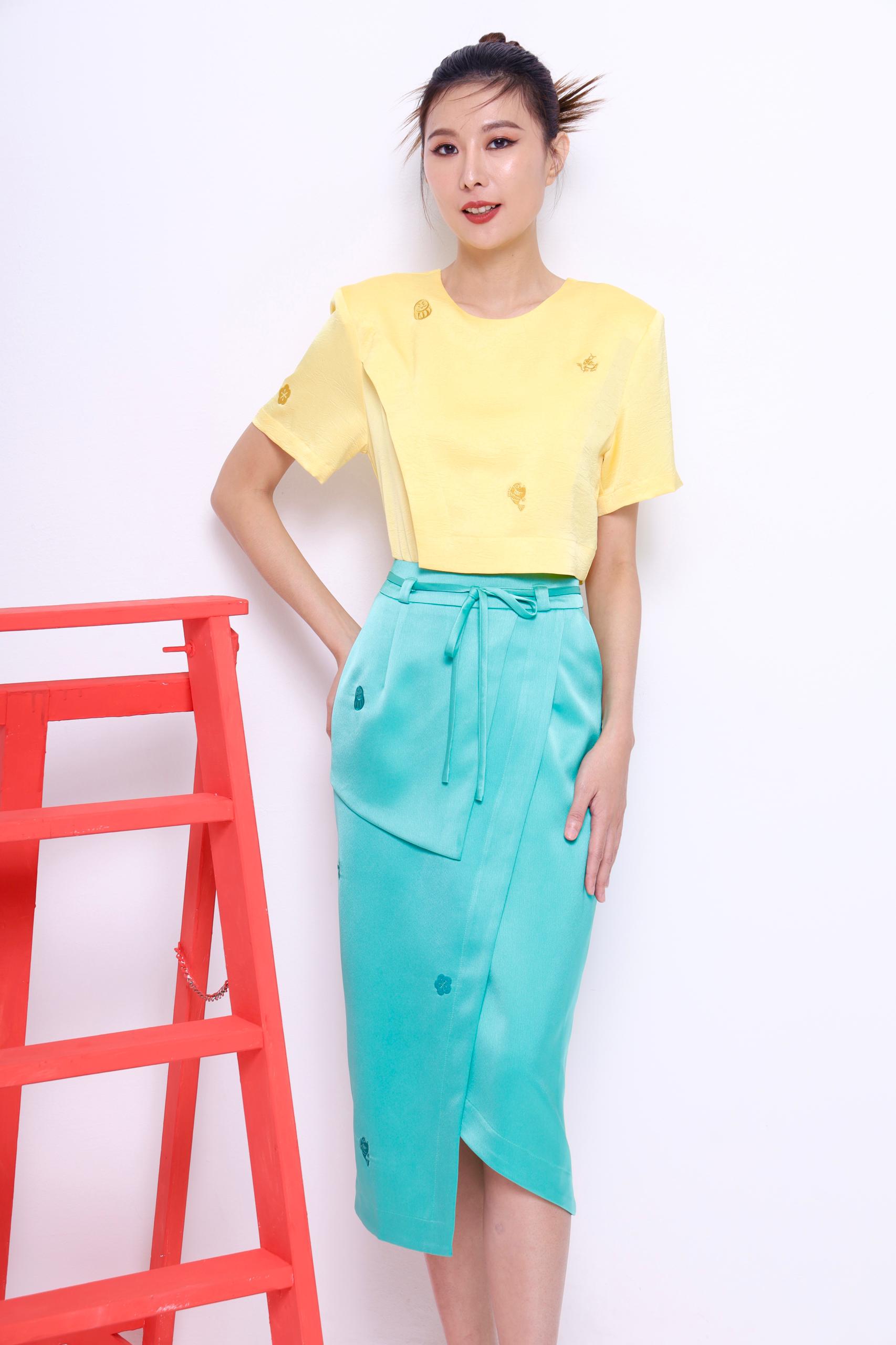A contemporary take on oriental charm — this midi wrap skirt features clean tailoring, a side pocket, and a subtle slit that flatters the silhouette. The matching fabric belt adds structure, while embroidered accents bring an artisanal touch. Perfect for cultural events or creative chic styling.