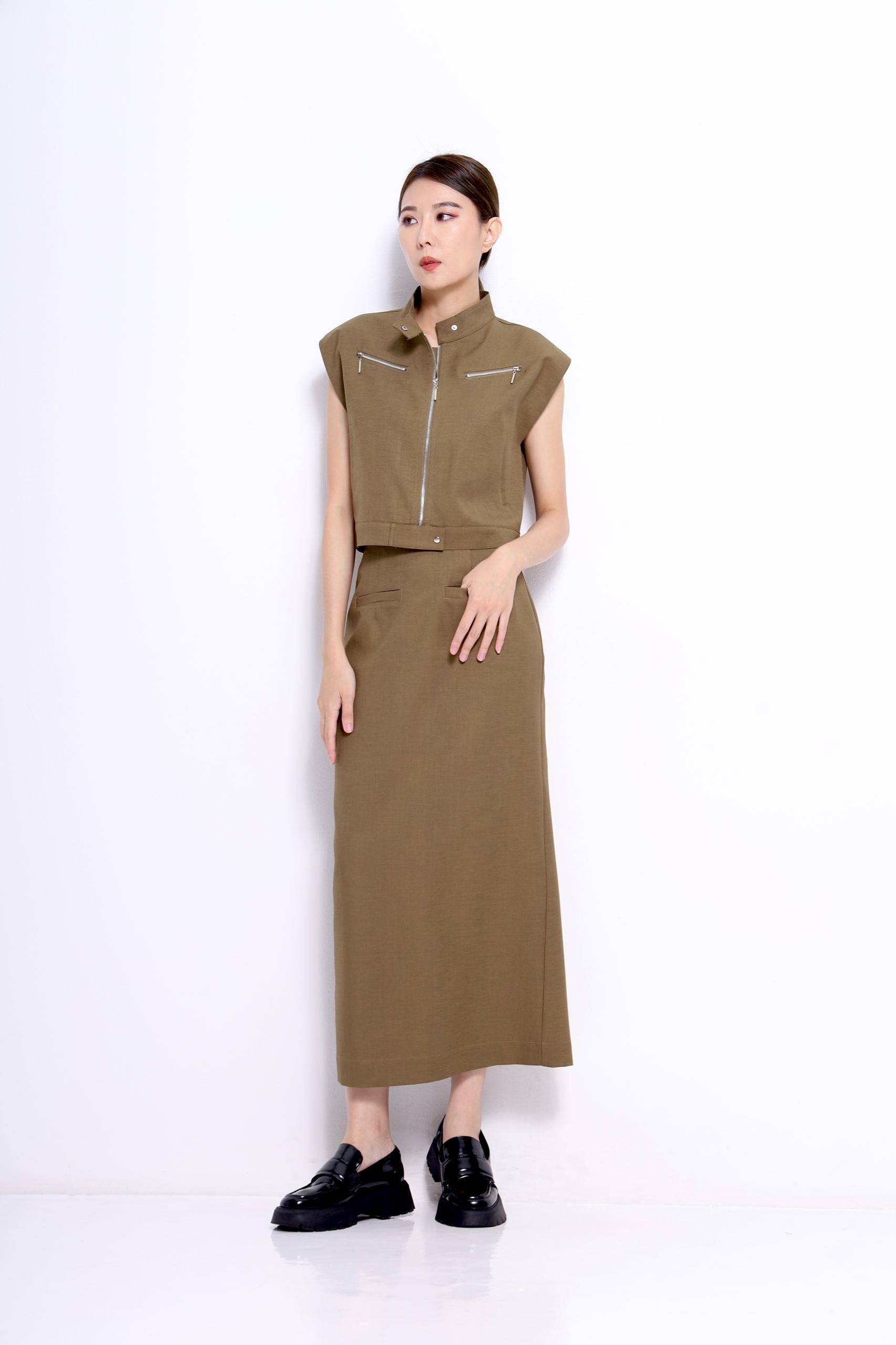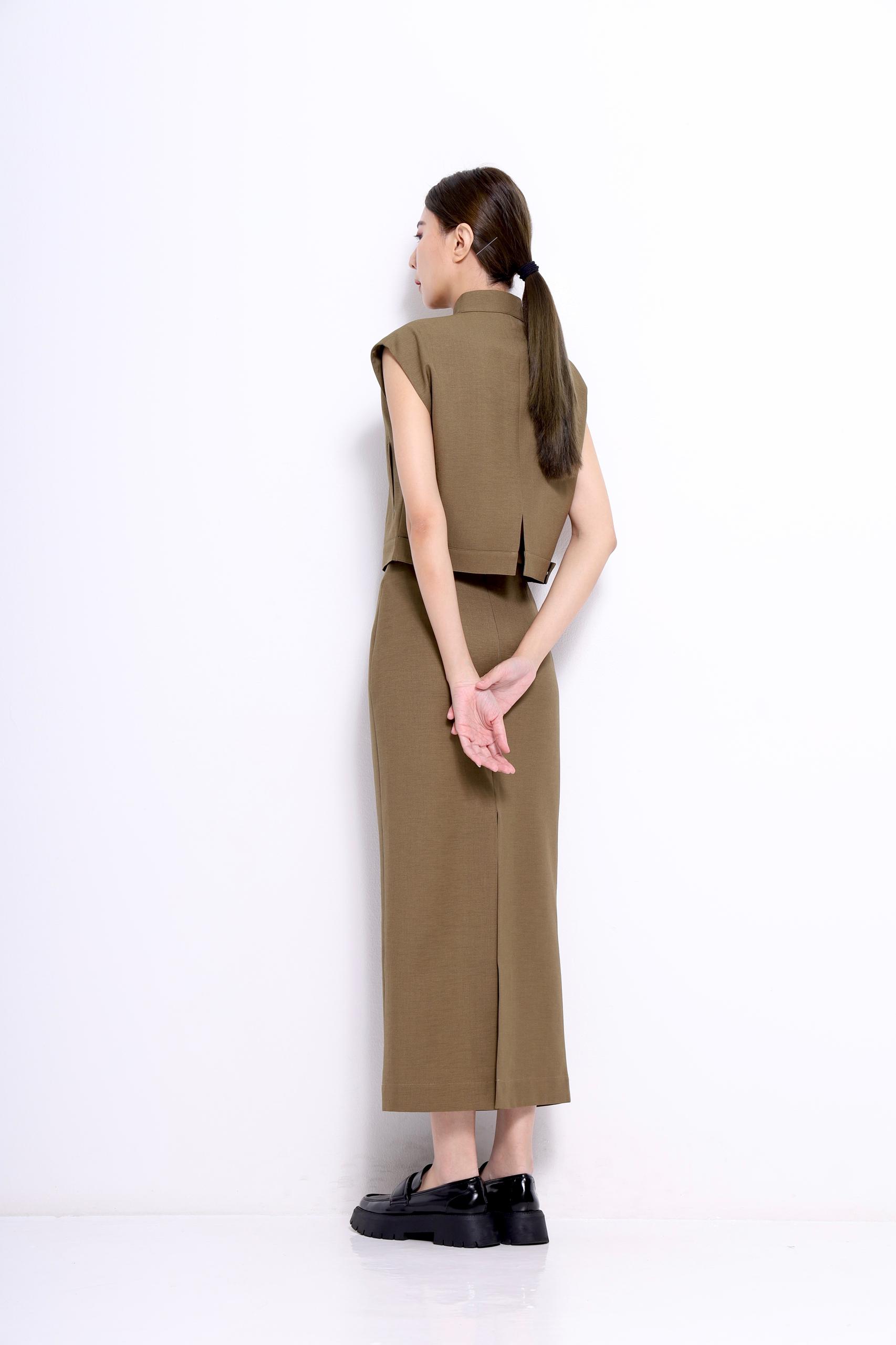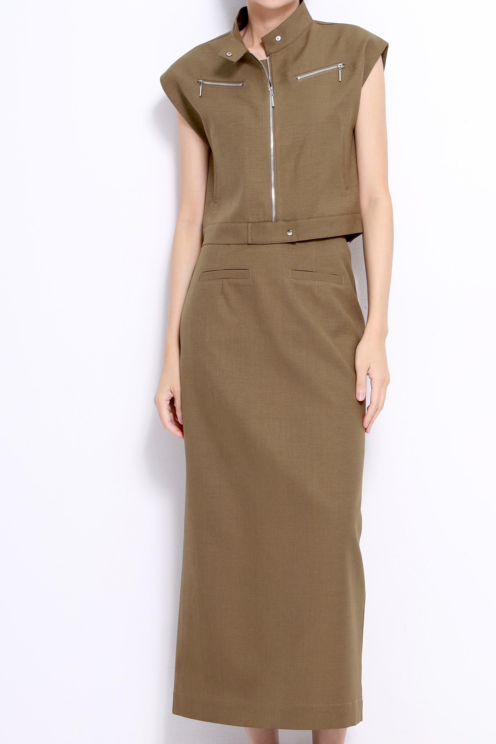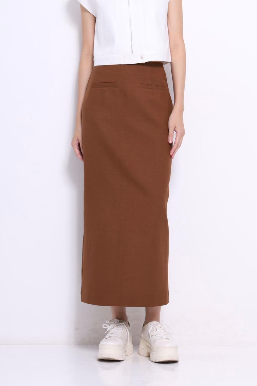 This is a high-waisted, straight-cut maxi skirt in an earthy olive tone. It features a clean, minimalist silhouette with a tailored waistband and a back pocket detail, offering a refined yet contemporary look that pairs effortlessly with structured tops.