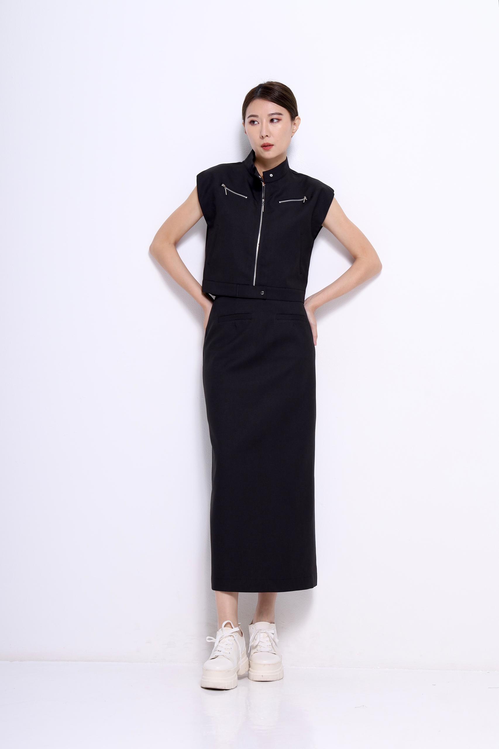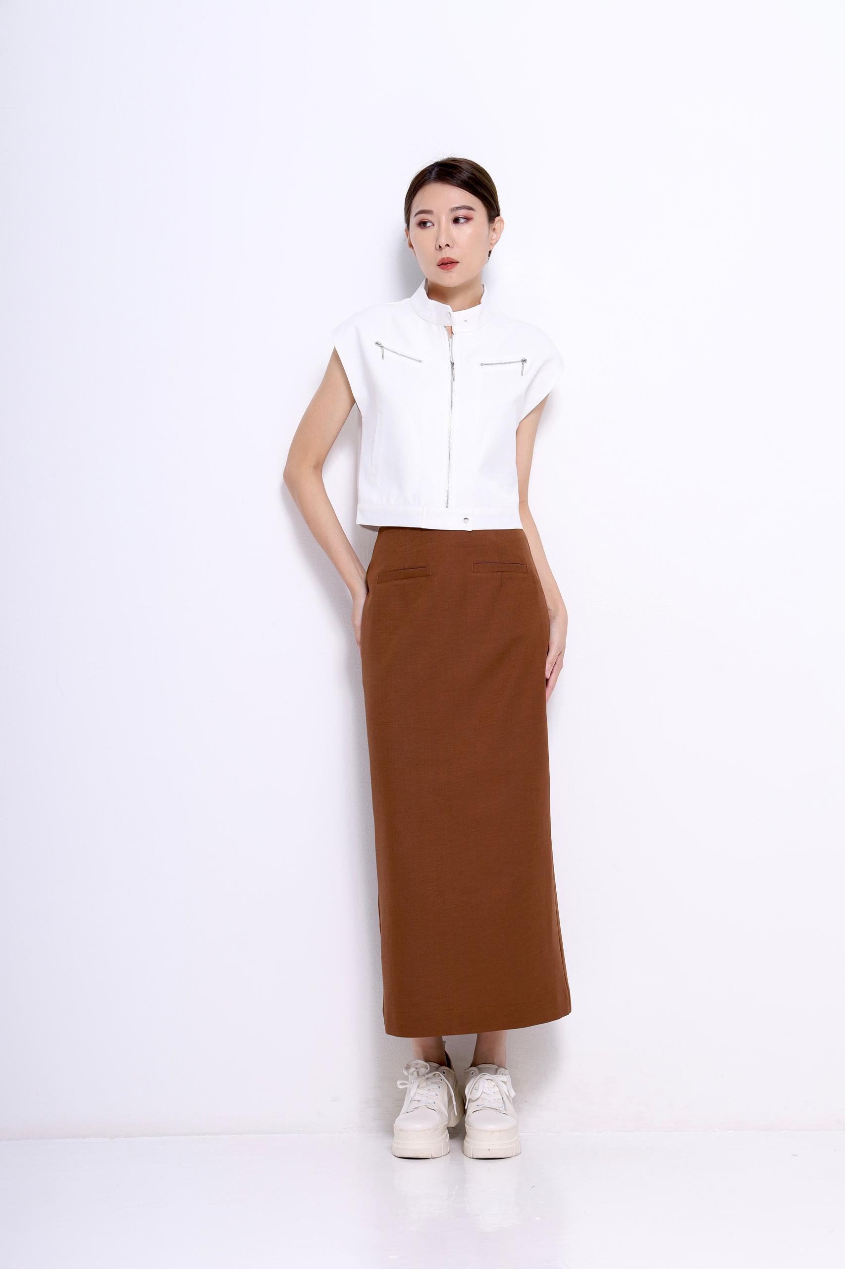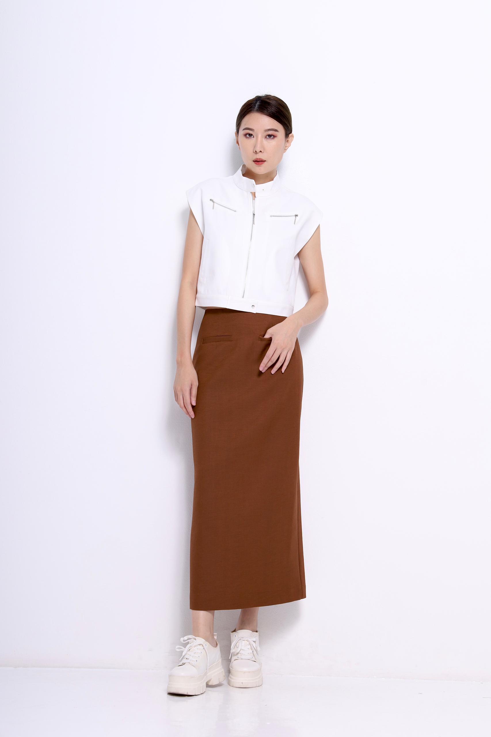 This is a high-waisted, straight-cut maxi skirt in an earthy olive tone. It features a clean, minimalist silhouette with a tailored waistband and a back pocket detail, offering a refined yet contemporary look that pairs effortlessly with structured tops.